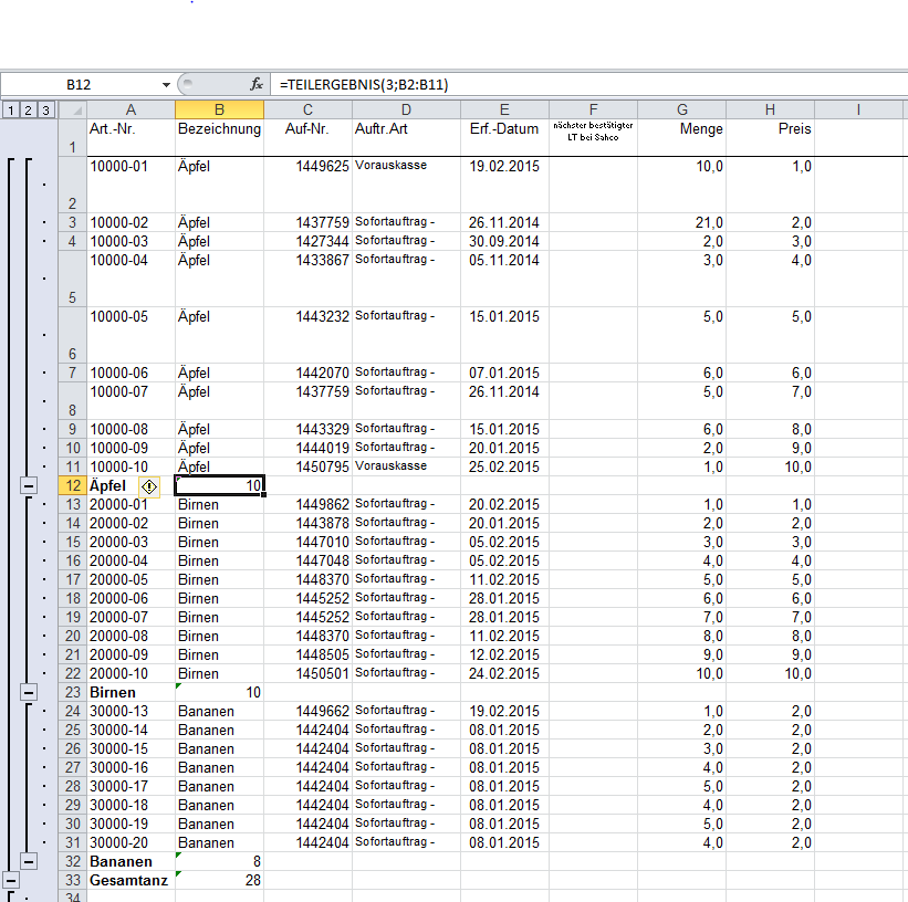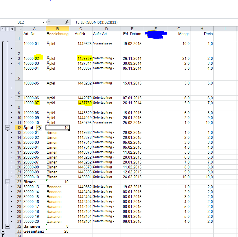 Wie man sieht wird hier richtig gezählt es sind insgesamt 10 Position vom Artikel: "Apfel" vorhanden. Leider werden hier natürlich logisch alle Bezeichnungen gezählt. Es sind aber leider unter einer Auftragsnummer als Beispiel: Auf-Nr.: 1437759 zwei mal die gleichen Artikel vorhanden. Da unter diesem Artikel eine weitere Farbe besteht nämlich Apfel:10000-02 und 10000-07. Hier soll aber das Duplikat nur einmal mitgezählt werden! ABER es sie müssen unter der Auftragsnummer trotzdem ersichtlich sein. Also bringt es nichts die Duplikate vorab zu löschen. Ich habe Es auch schon mit dem doppelten verwenden vom Teilergebnis versuch aber ohne Erfolg.
