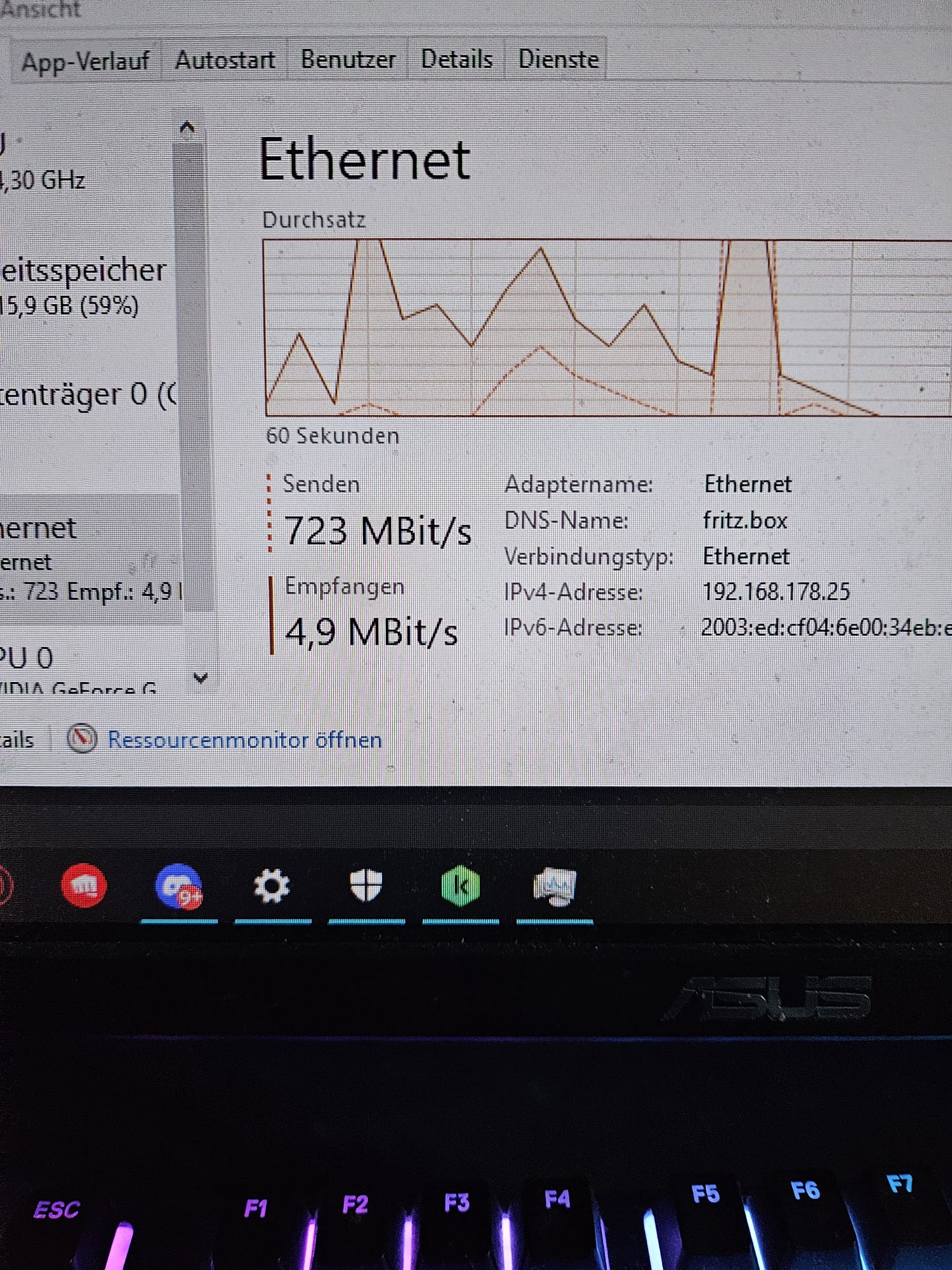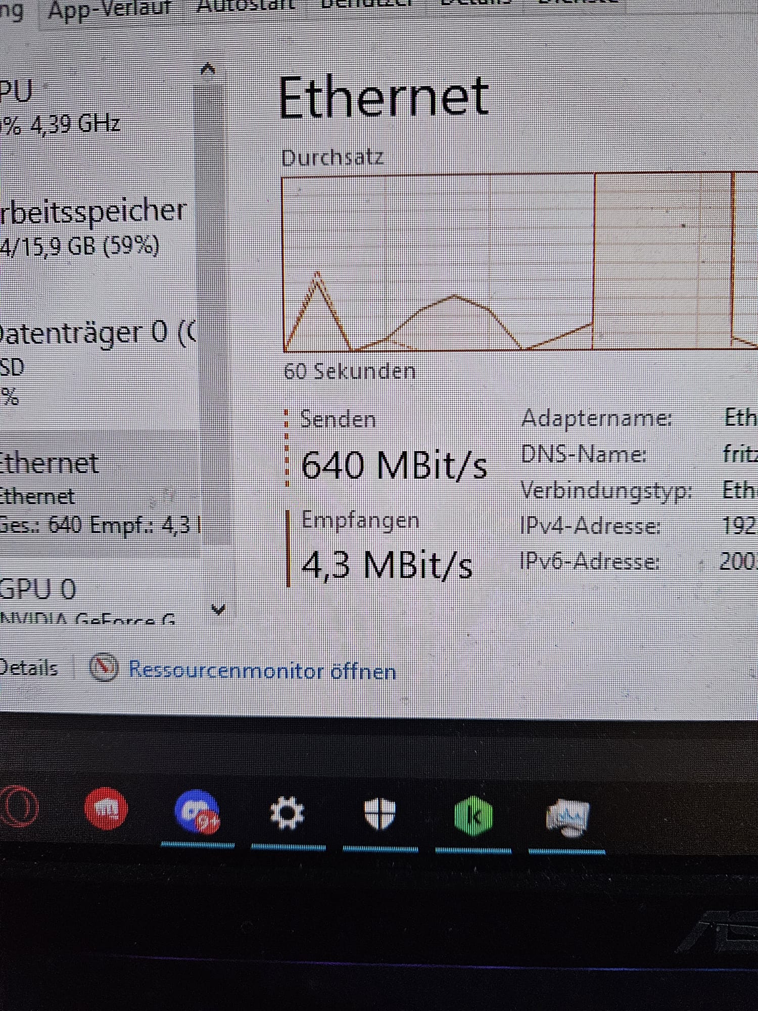 Und nun kommt der Hammer!!! ich habe jetzt die Fritzbox und gestern ein Lan-Kabe getauscht und nach dem direkten Test, noch mal alles umgesteckt und tataaaaaa, ich habe 640MBit erreicht, bzw das, was ich so schnell überhaupt fotografieren konnte!!!!!!!!!!!!