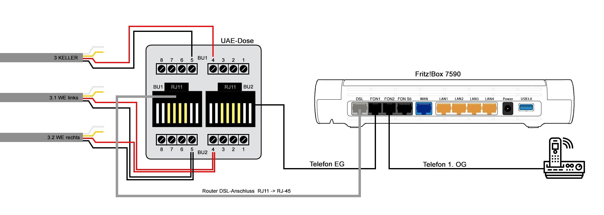 Aus Kostengründen teilen diese sich einen Telefonanschluss, sodass das Telefon meiner Oma im 1.OG an die FritzBox meiner Mutter angeschlossen wird. In den FritzBox-Einstellungen werden dann jedem Telefon eine seperate Rufnummer zugeordnet.