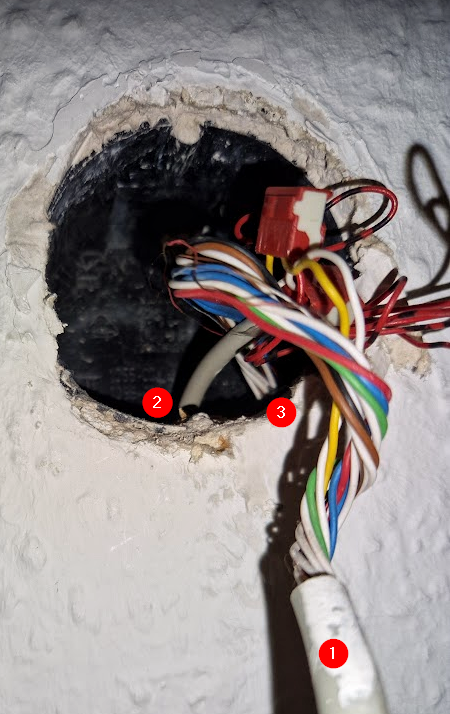 - Im Schlafzimmer gibt es genauso eine Dose. Das Schlafzimmer befindet sich im Erdgeschoss auf der gegenüberliegenden Seite des Hauses. Wie die roten Drähte dahin kommen, weiß ich nicht. Vielleicht von der unauffindbaren Abzweigung?