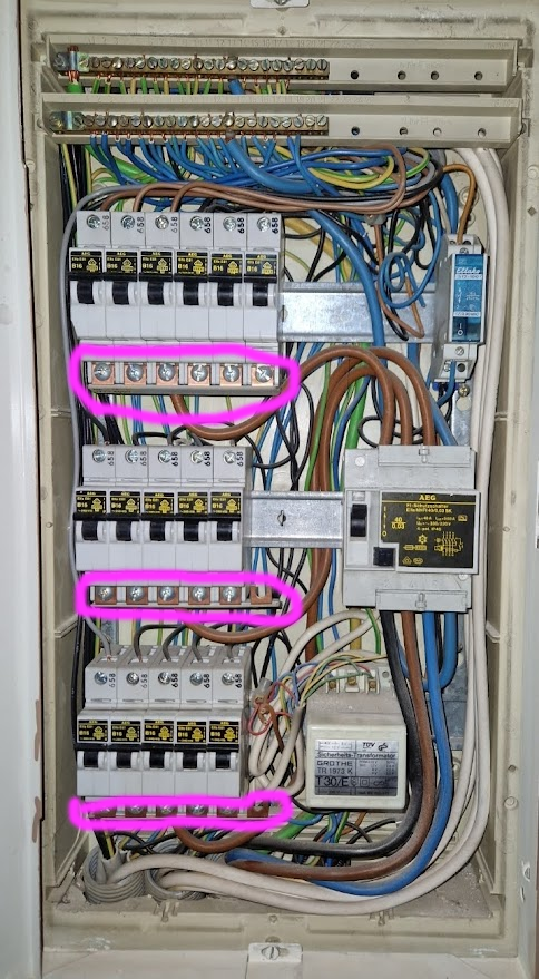 - Sollte mein Vorhaben, aus den bunten Drähten Ethernet zu basteln fehlschlagen, bliebe mir der Einsatz der G.hn-Geräte von Allnet (was haltet ihr davon?) oder das Ziehen eines oder zweier Verlegekabel durch zu bohrende Löcher. Der Kabelweg wäre: Arbeitszimmer --> Abstellraum --> Garagenspeicher --> Garage --> Leerrohr in einem Sicherungskasten --> Keller. Eigentlich unproblematisch. Nur vor dem Sicherungskasten graut es mir, auf dem Foto sieht man, wie dort bereits Satelitenkabel durchgeführt werden, neben die ich dann die LAN-Kabel in die Leerrohre legen müsste.