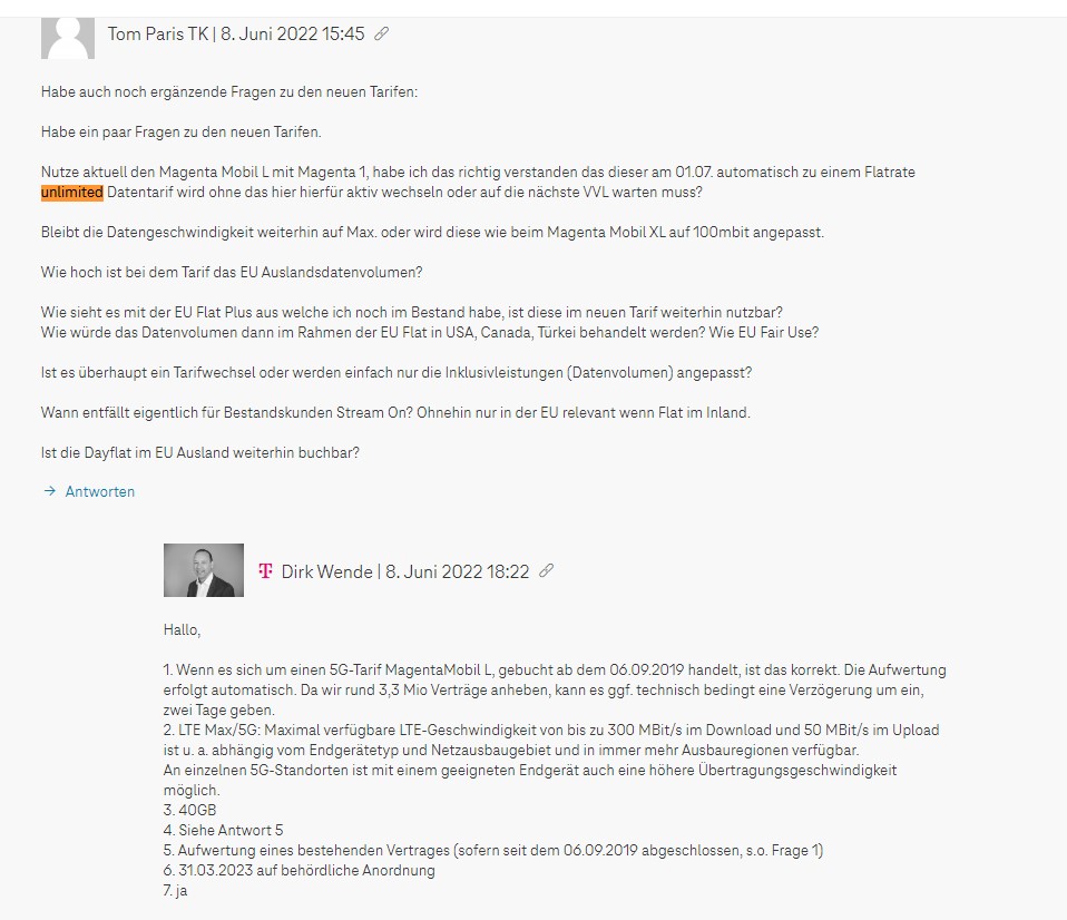 Da steht, dass das Datenvolumen automatisch auf die Altverträge mit übertragen wird und somit L Young Tarife mit Magenta 1 auch ab 01.07 Unlimited Datenvolumen Internet bekommen. Haben diese Alttarife auch die Möglichkeit, MagentaMobil PlusKarten zu bestellen? :-)