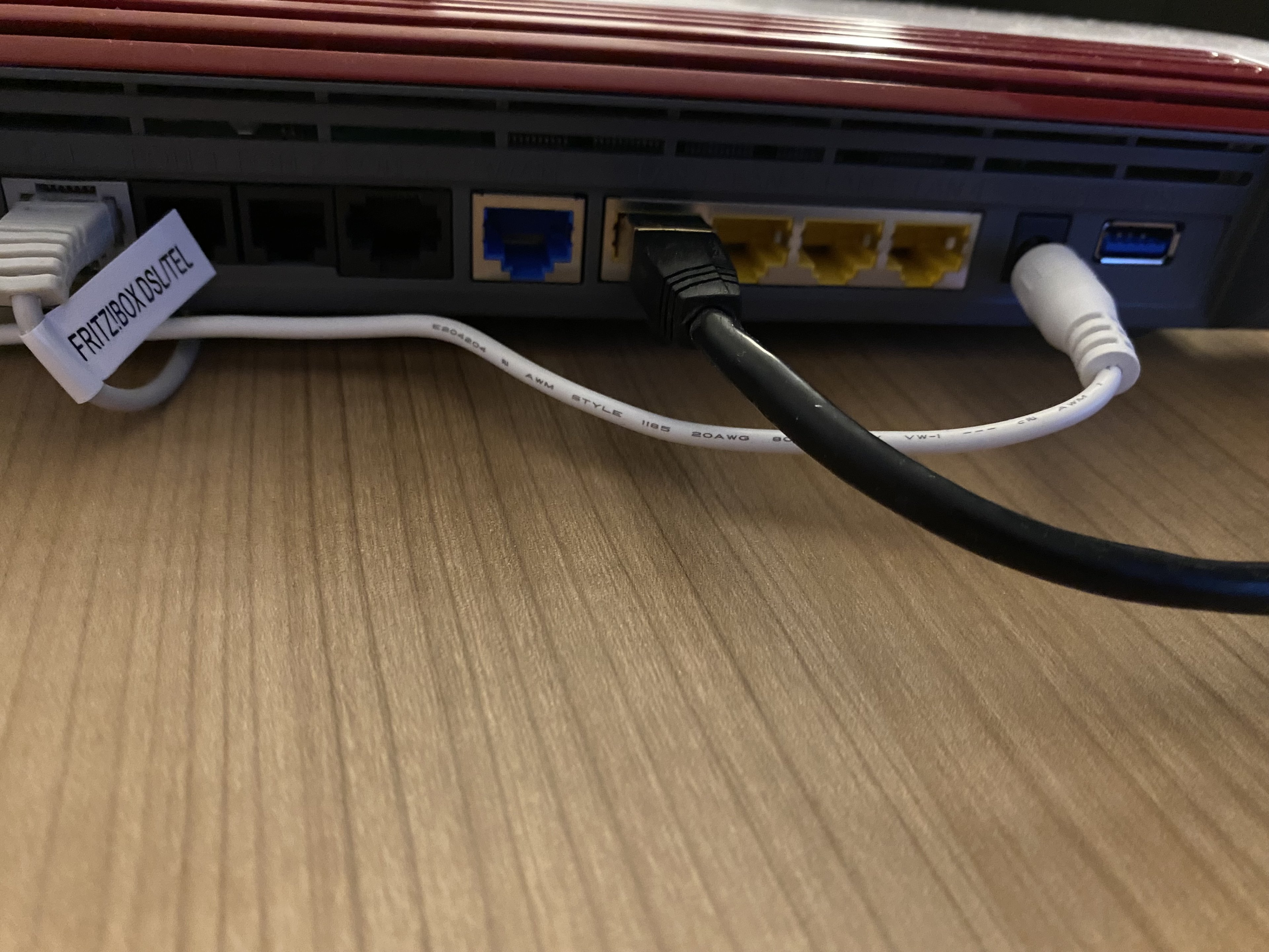 Nun wollte ich den Anschluss in betrieb nehmen und fing an die Fritzbox 7590 mit dem beigelegten Kabel DSL - Telefonanschluss mit dem Router sowie der Telekom Dose zu verbinden.