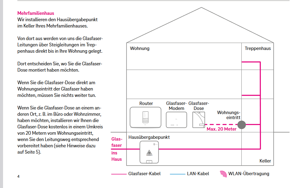 dann kommen aber Anleitungen, in denen explizit darauf hingewiesen wird, dass man sich selber um den "Leitungsweg" aus dem Keller bis zur Wohnung kümmern muss. Innerhalb der Wohnung werden dann noch bis zu 20m verlegt, wenn alles dafür vorbereitet ist.