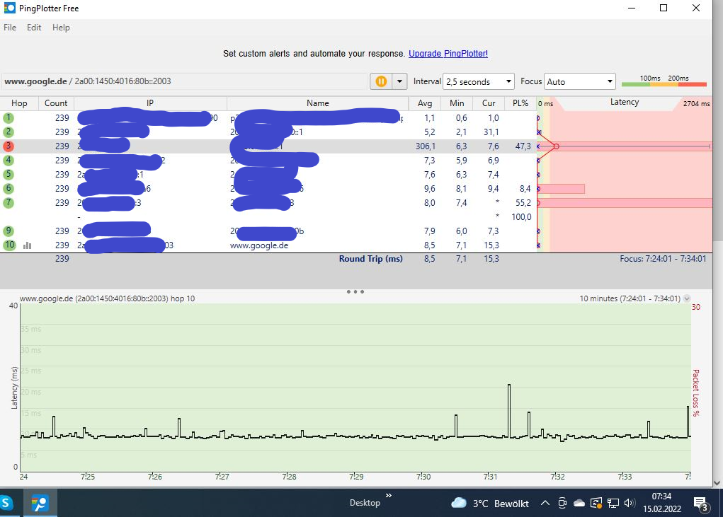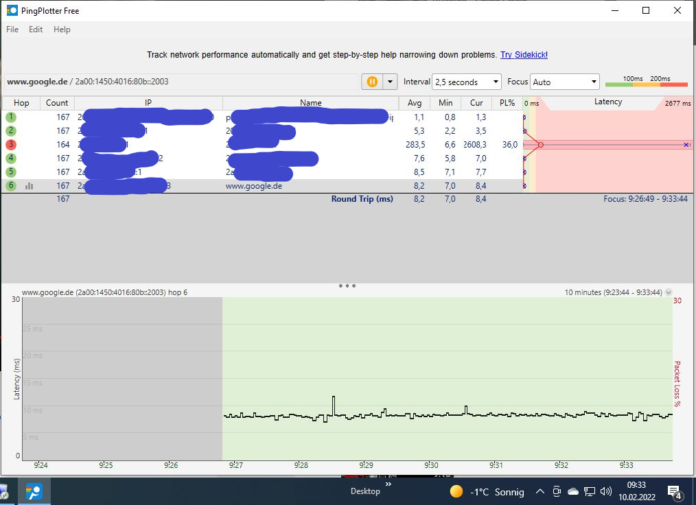Das ganze habe ich mit Pingplotter getestet und zu erkennen ist, dass es am dritten Hop liegt. Was bedeutet nun der dritte Hop? Wo genau könnte das Problem liegen? Anbei hänge ich euch mal zwei Screenshots an (eines von heute, das andere von vor ein paar Tagen).