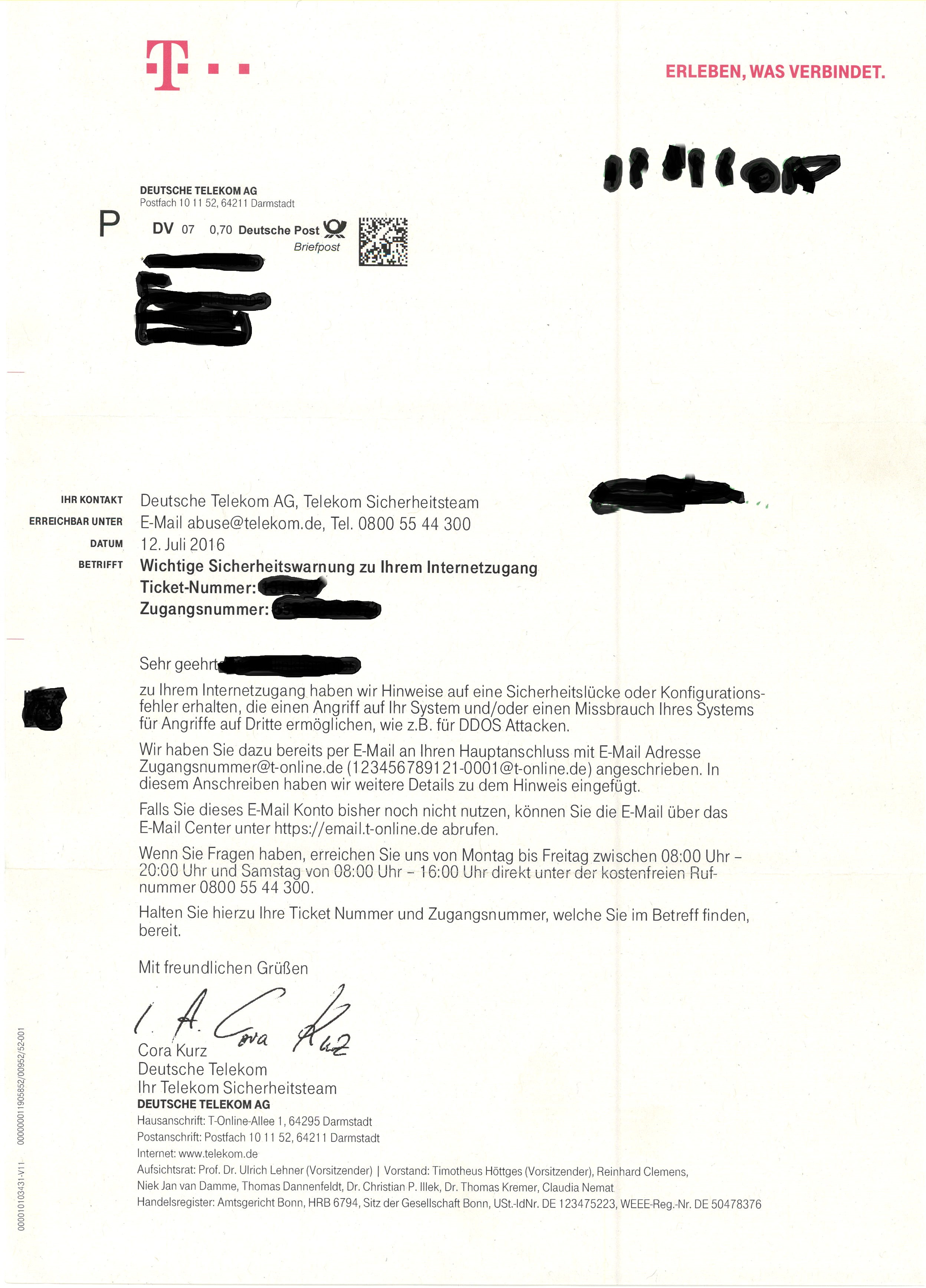 Mag sein, dass das eine bekannte Masche ist. Aber das Schreiben der "Telekom" wäre damit schon sehr perfekt gefakt, oder? In der Qualität hätte ich das noch nicht gesehen. Anbei das Anschreiben und die Mail.