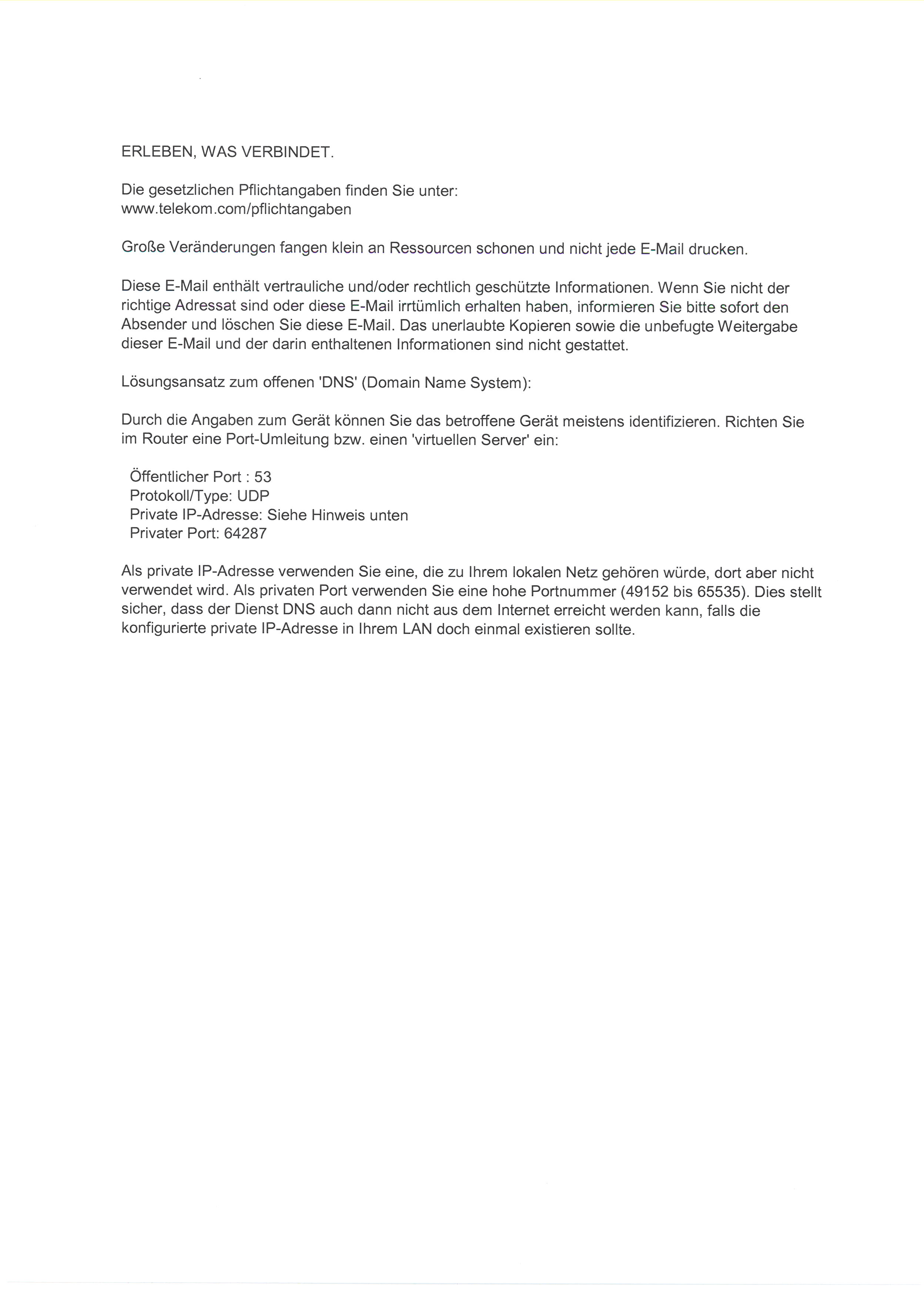 Wenn Port 53 wirklich offen sein sollte auf deinem Router (wäre nicht so gut und auch nicht üblich) würde ich ihn entweder schließen sofern möglich (evtl. hilft schon ein Firmware-Update) oder, wie die Telekom schon in ihrer eMail geraten hat, ins "Nirgendwo" umleiten. Das Umleiten ist nur ein "quick&dirty" Workaround und keine echte "Lösung".