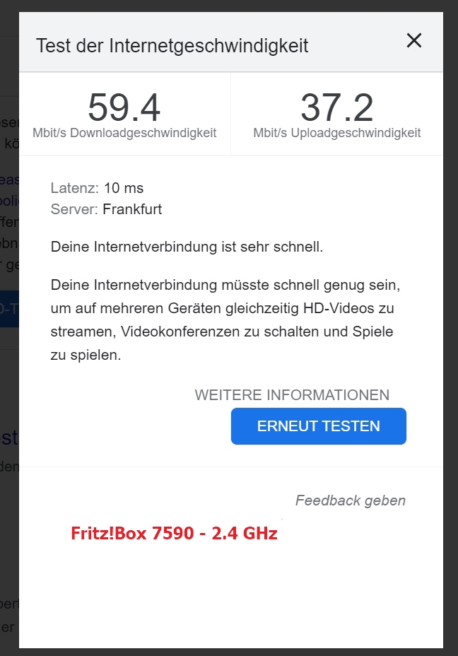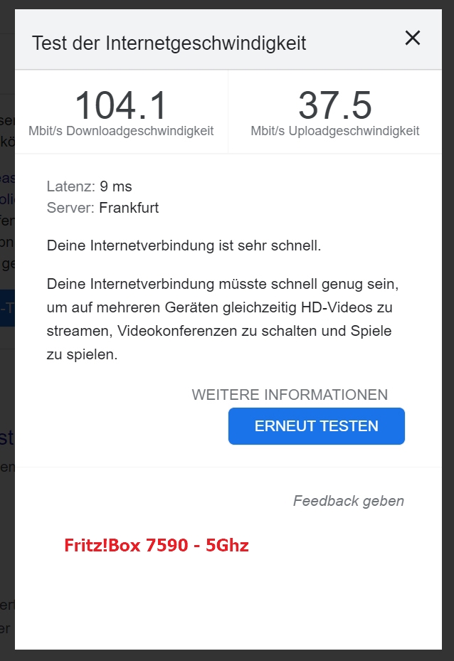 Die Frage war eher, auf welchem WLAN-Kanal (GHz) die FRITZ!Box ist, wieviele Spatial-Streams (Anzahl) und welche Kanalbreite (MHz) der Computer erlaubt. Das siehst Du in auch in der Mesh- bzw. Netzwerk-Übersicht Deiner FRITZ!Box – während eine Datenübertragung aktiv ist. Das ist das Problem: Du hast Spatial-Streams und Kanalbreite – und in beidem ist die FRITZ!Box 7590 sehr gut.