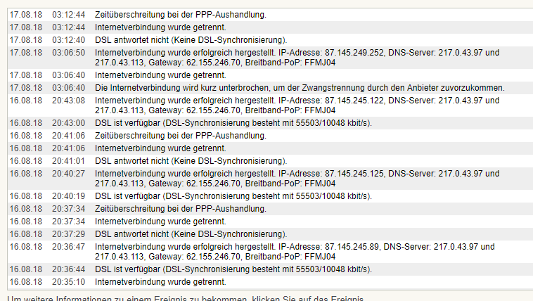 ich bin zum 1.8. umgezogen und habe jetzt in der neuen Wohnung einen VDSL 50 Anschluss der Telekom. Hier im Forum habe ich mir dazu eine FritzBox! 7360 (mit Branding von EWE - was aber ja keine Rolle spielen sollte) gekauft. Nun habe ich öfter mal Probleme mit der Internet Verbindung. Meist habe ich abends gegen 22 Uhr rum Verbindungsabbrüche. Für ca. 15-20 Minuten kriege ich dann in der Regel keine Internetverbindung mehr, auch wenn ich den Router mehrmals neustarte. Habe auch schon 2 Tickets bei der Telekom aufgemacht, aber das erste mal wurde ich mit "Router defekt" abgespeist und das zweite mal habe ich einfach nur diesen netten Text bekommen: