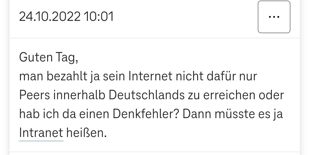 Nicht nur sind die Laufezeiten höher, ich habe auch massiv Packetloss. Kann das an meinem Rechner / Fritzbox liegen oder eher an der Telekom? Ein Trace würde mich ja eher hin zur Telekom hin verleiten, aber das Problem besteht schon seit Wochen - dann hätten sich doch schon mehr Leute gemeldet.
