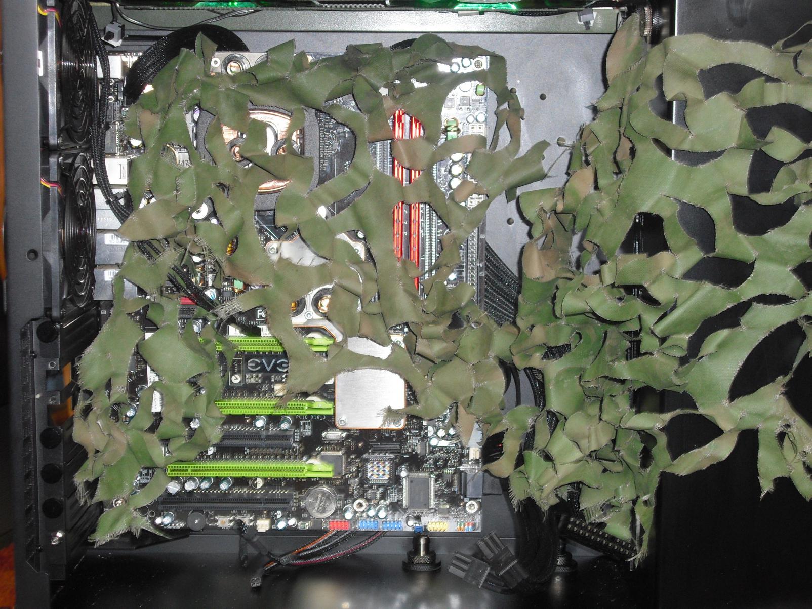 Ansonsten siehts aber schon sehr geil aus. Würde aber das Tarnnetz nur an manchen Stellen von oben oder so ein wenig runterhängen lassen, also dass man die Hardware noch gut sieht. Oder du kannst damit ja auch ein paar Kabel "tarnen". So wie auf deinen "Spaßbildern" würde ichs aber auf keinen Fall machen.