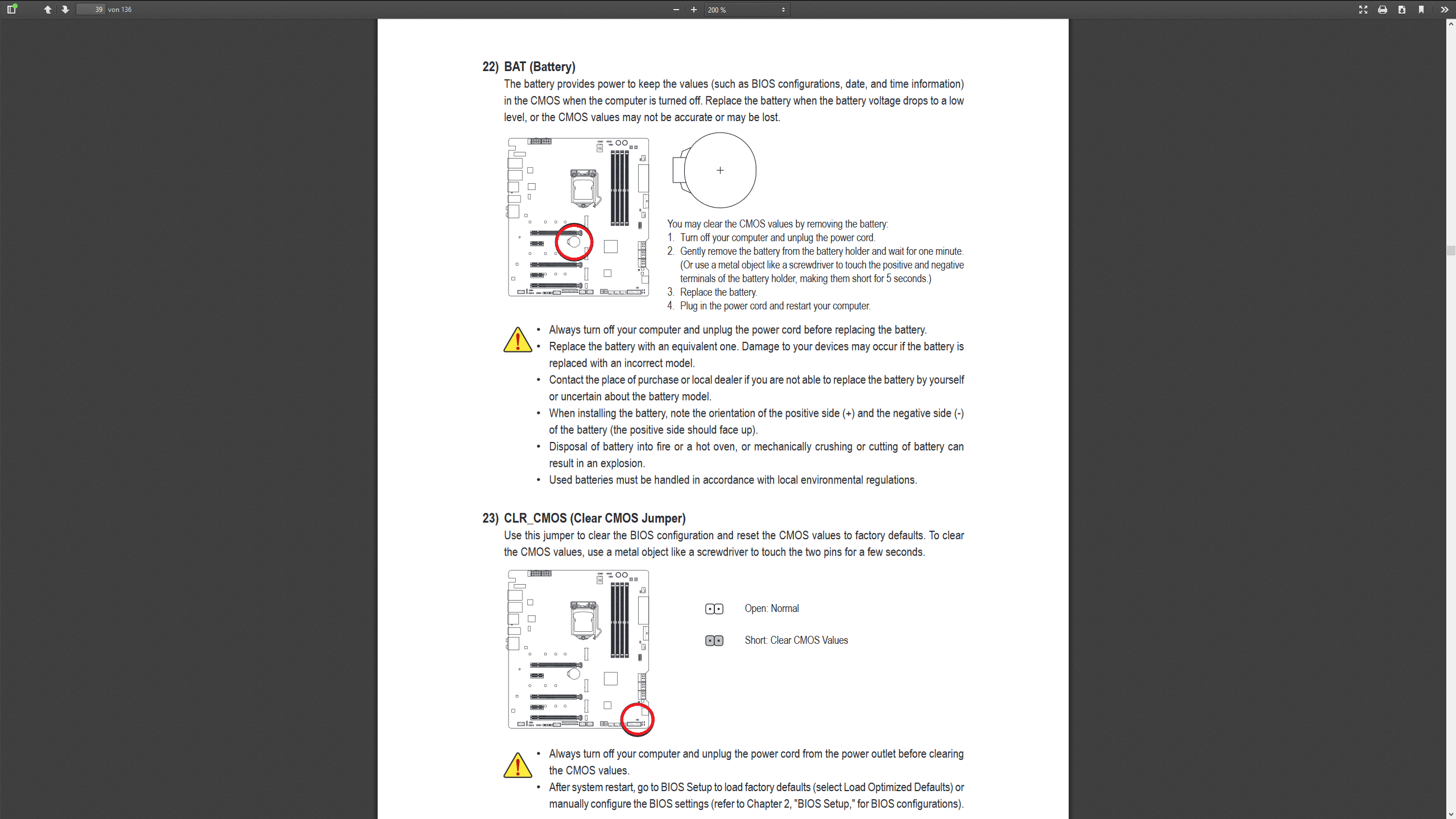 Dies führt dazu, dass die BIOS-Konfiguration gelöscht und der CMOS-Wert auf die Werkseinstellungen zurückgesetzt wird. Um die CMOS-Werte zu löschen, Entferne erst die Batterie, dann verwenden Sie ein Objekt, um den Antrieb für einige Sekunden zu berühren.
