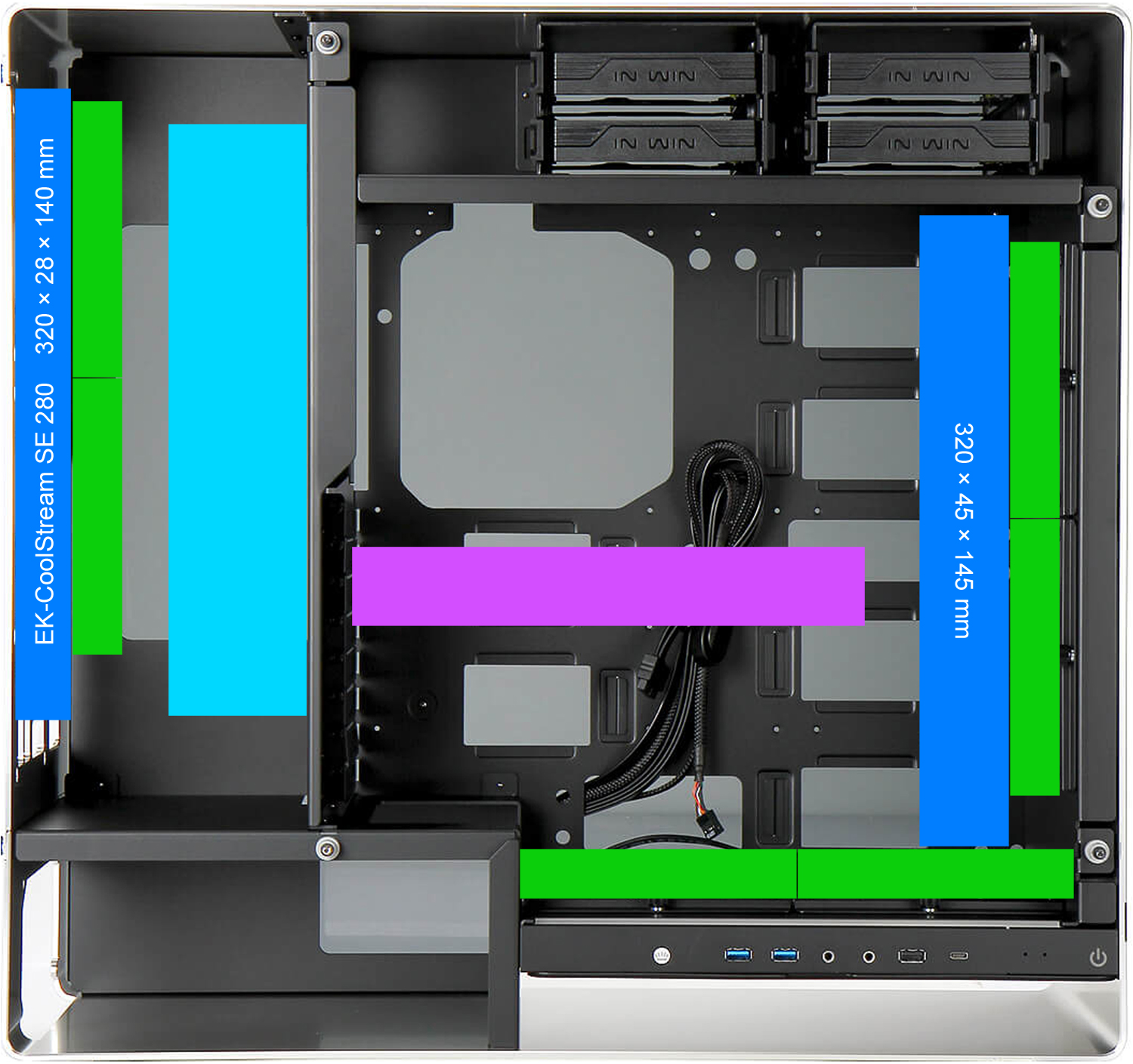 Die 4 Lüfter auf den beiden 280er Radiatoren laufen auf Volllast mit 1200 rpm und erzeugen einen Statischen Druck von 1,58 mm-H2O und die D5 läuft IMMER mit 2000 rpm.