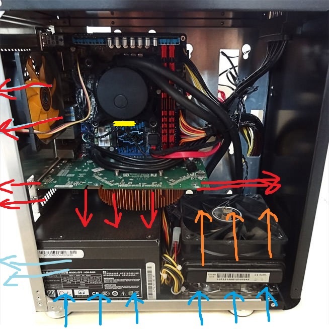 Ich hab das mal provisorisch als Bild dargestellt, wobei das ein Herstellerbild ist und die Komponenten nicht direkt übereinstimmen (Graka in echt breiter, aber etwa gleich lang und nur ein Radiatorlüfter).