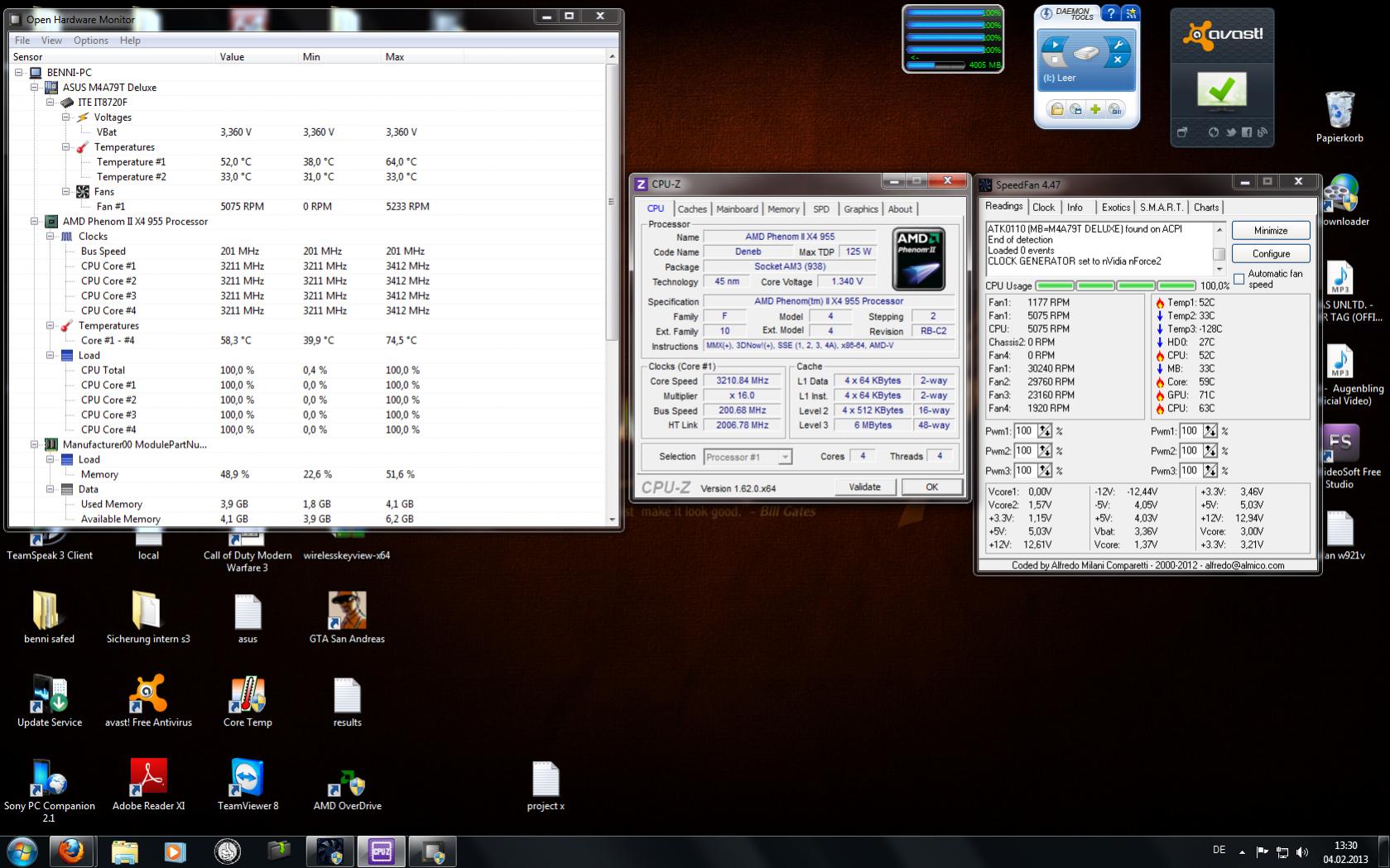 CPU "AMD Phenom II X4 955BE" ? Ich komme auf die Frage weil, ich meinen lüfter mit "SpeedFan" auf 85% gesetzt habe und die CPU 69C (voll last) erreichte mit 100% sind es 66C (boxed Lüfter vom "Phenom II X6 1100T") so weit ich weiß darf er ja nur Max 60C haben.