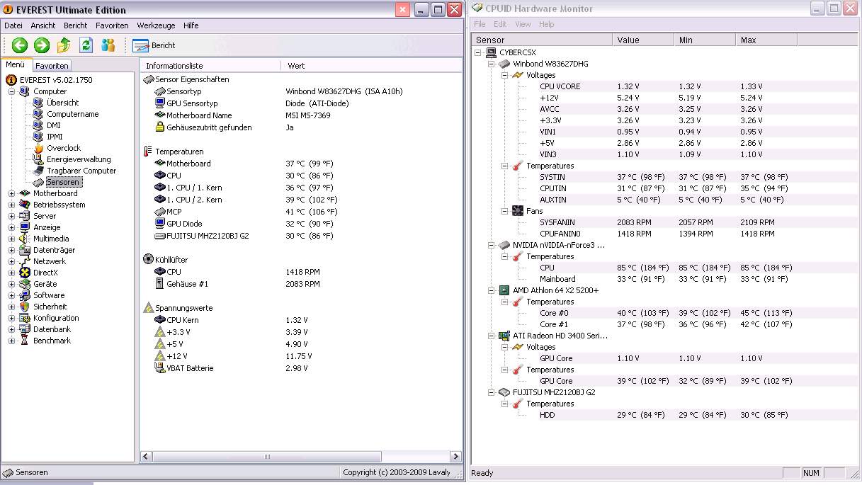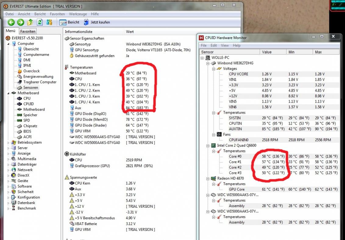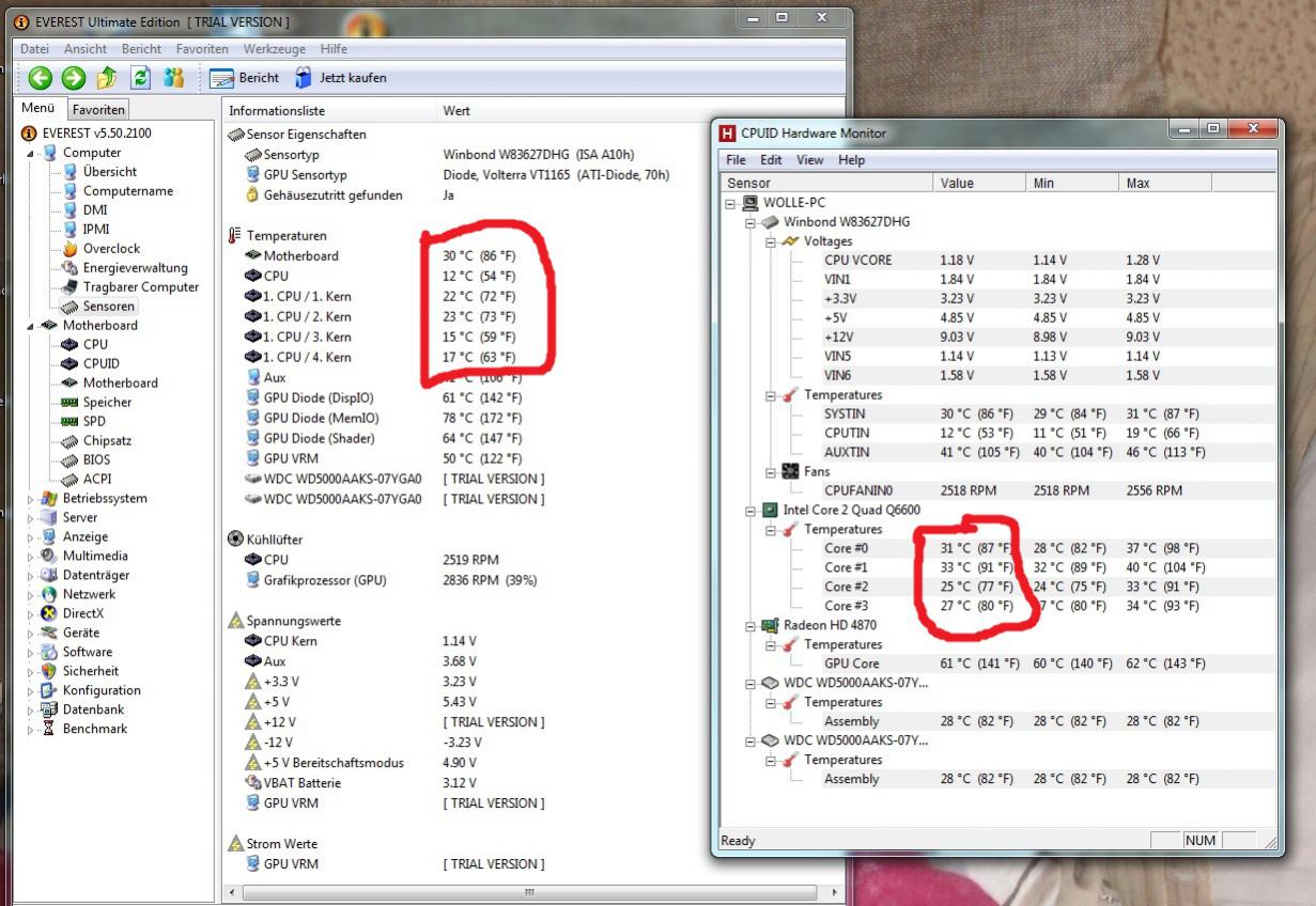 Ich habe eben meine Temperatur mit everest und hwmonitor gemessen zwichen den