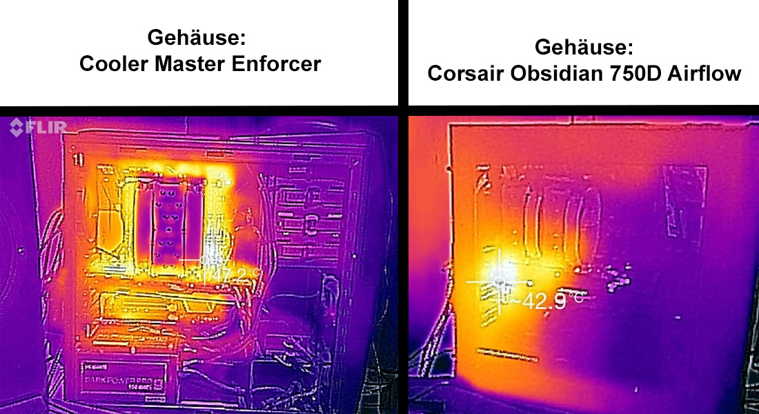 Einmal richtest du das Messgerät direkt auf die Hardware und das andere Mal richtest du dass Messgerät auf die Seitenwand des Gehäuses. Die Wärmebildkamera blickt nicht auf selbe Weise durchs Fenster, wie es das Auge tut. Ich will ja nicht sagen, dass das Cooler Master besser ist als das Corsair und ich hab auch keine subjektive Meinung zu den Herstellern, da mein Gehäuse zum Beispiel von einem ganz anderen Hersteller kommt. Ich will nur sagen, dass du deine Bilder nicht direkt miteinander vergleichen kannst.