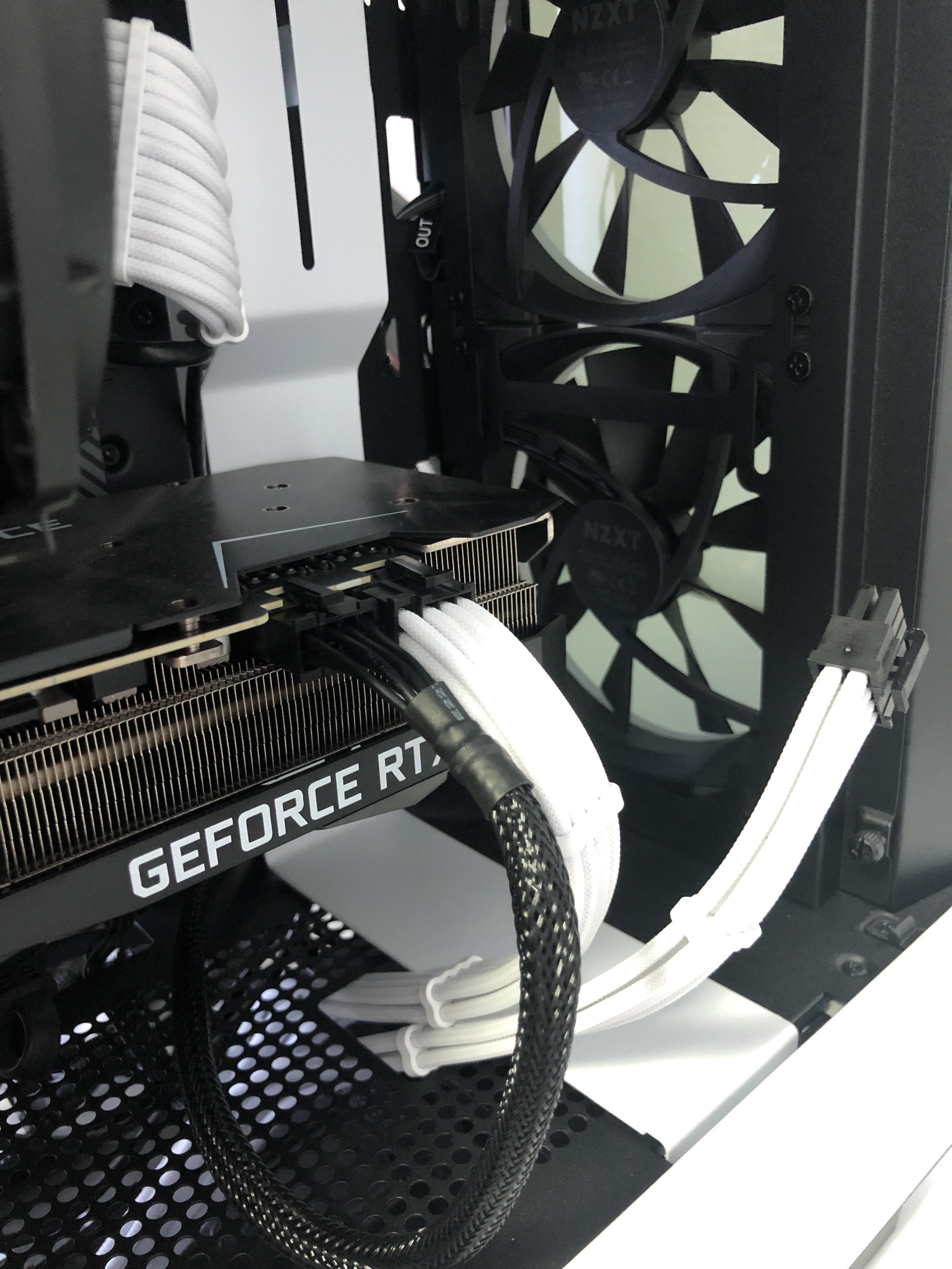 Technisch betrachtet, sollte es jetzt eigentlich funktionieren. Ich würde es noch einmal mit der Entfernung der Verlängerungskabel versuchen und die originalen Kabel benutzen. Denke dran, einen Stromstrang von PCIe1 vom Netzteil an einen Anschluss an die GPU und den Stromstrang vom Netzteil PCIe3 zum zweiten Anschluss auf der GPU.