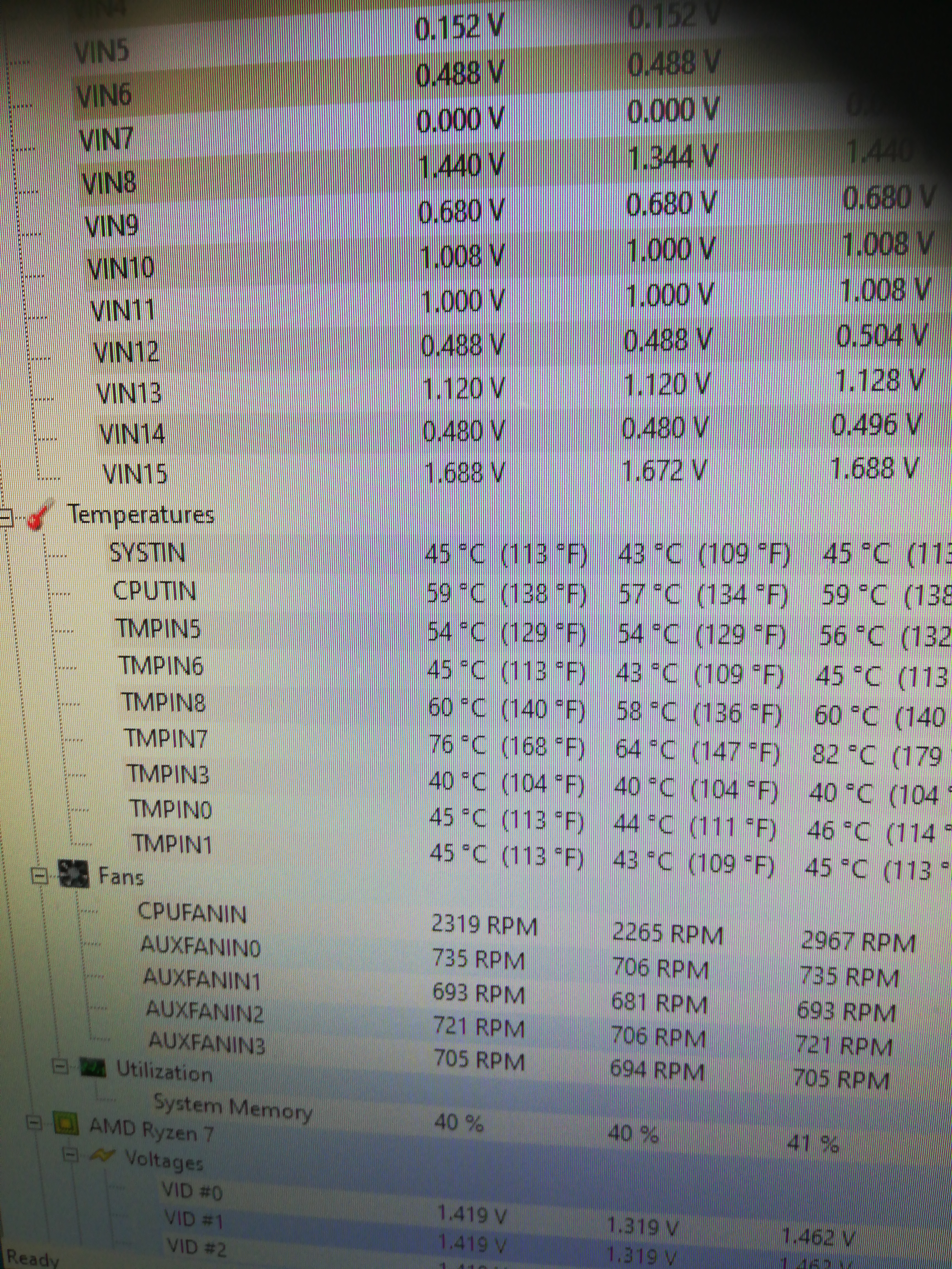 Tmpin 5,7, 8 sind sehr hoch. Bei dem Bild bin ich grad aus dem Spiel raus die lagen auch schon bei 80 C° Soll wohl Mainboard und Chipsatz sein. CPU klettert trotz Kühler auf vollast auch gern auf 70 oder etwas höher sind die Temperaturen OK oder ist das zu warm? Wobei man auch selbst wenn der CPU Kühler auf 2500 läuft nichts hört die Gehäuse Lüfter können nicht mehr wie 800rpm.