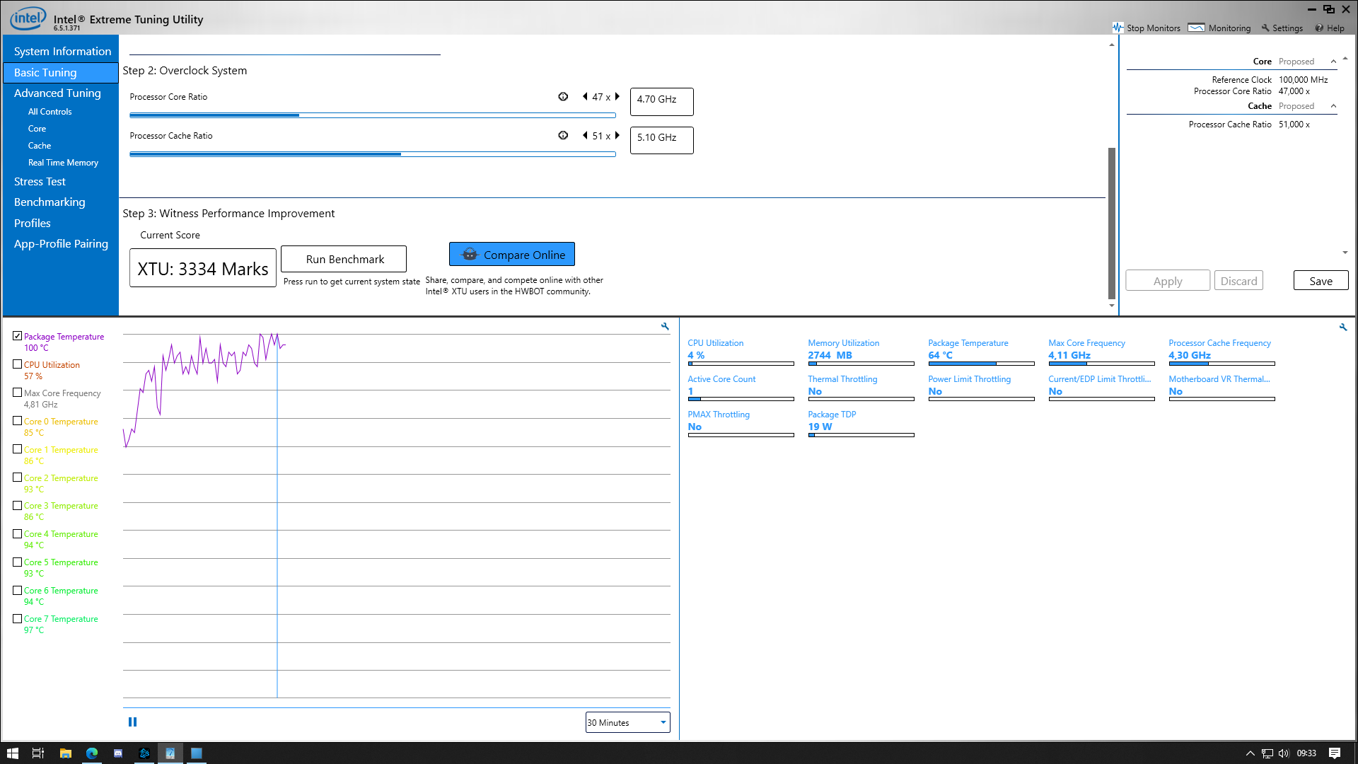 Ich habe jetzt das Problem, dass der PC beim zocken bis zu 100 Grad heiß wird. Ich habe euch mal einen Screenshot von Intel XTU beigefügt, der das in nem Graphen beweist.