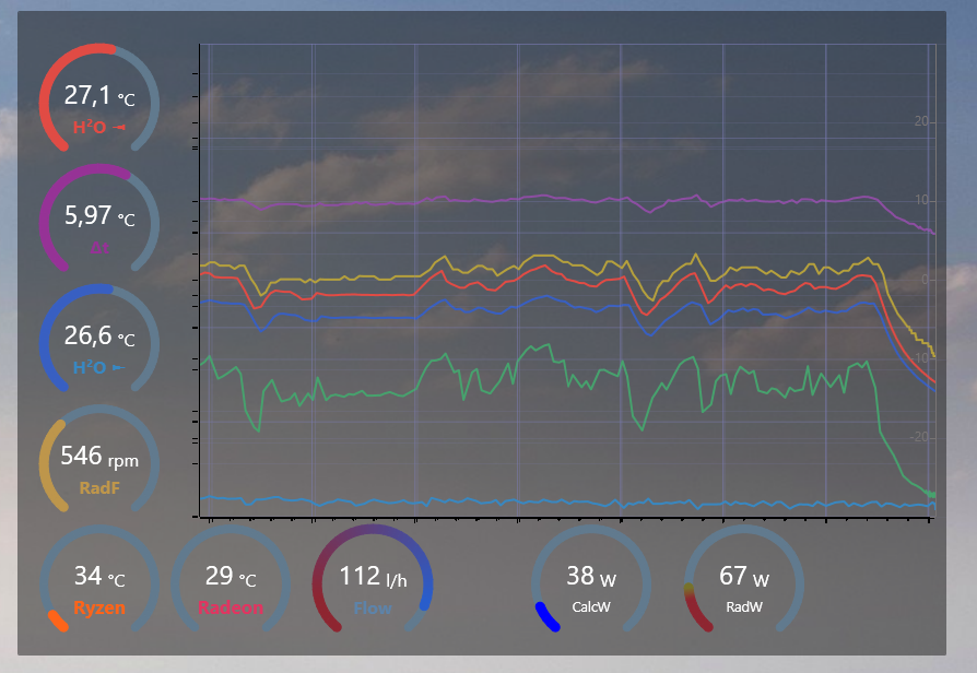 Ich habe zwei Lüfterkurven für die Lüfter auf den Rads eingerichtet. Jede Kurve ist logischerweise abhängig vom jeweiligen Wassertemperatursensor des Loops. Die Kurven starten bei einer Wassertemperatur von 27C mit der Kühlung. Ab 30C Wassertemperatur laufen die Lüfter mit 100%. Momentan sehen die Temperaturwerte sehr gut aus (denke ich). Nachdem ich 2h gezockt habe, sieht das etwa so aus: