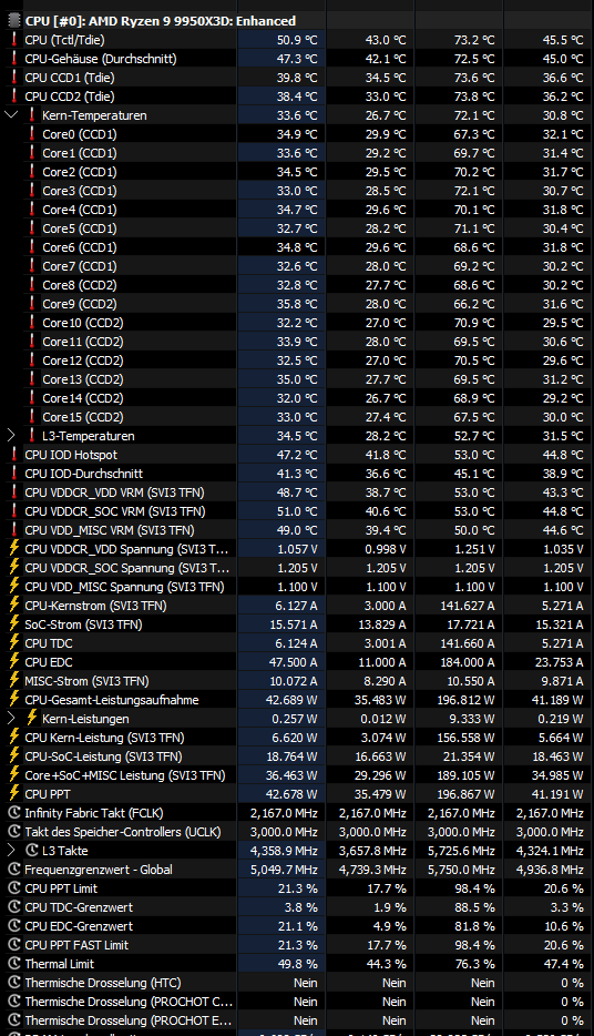 ... Ich bin nun nach langer Zeit mal zu AMD gewechselt und habe da eine Frage bzgl der Temperatur . In HWInfo hatte man bei Intel ja immer einen Wert der einem die Temperatur der CPU angezeigt hatte . Welcher Wert ist denn nun bei AMD relevant ? CPU tctl/tdie oder CPU CCD 1 tdie bzw CCD 2 tdie. Mir wird nämlich im Idle bei CPU tctl/tdie eine für mich doch relativ hohe Temperatur von 48-55 grad angezeigt . Montiert ist ein Alphacool Apex 1 Wasserkühler inkl Thermal Grizzly Duronaut WLP. Zuvor hatte ich einen i9 12900k , welcher wesentlich niedrigere Temperaturen hatte , gerade im Idle . Unter last zb im Cinebench R23 pendelt sich die Temperatur zwischen 75-80 Grad ein . Sind diese Temperaturen denn normal ? Auch die im Idle ?