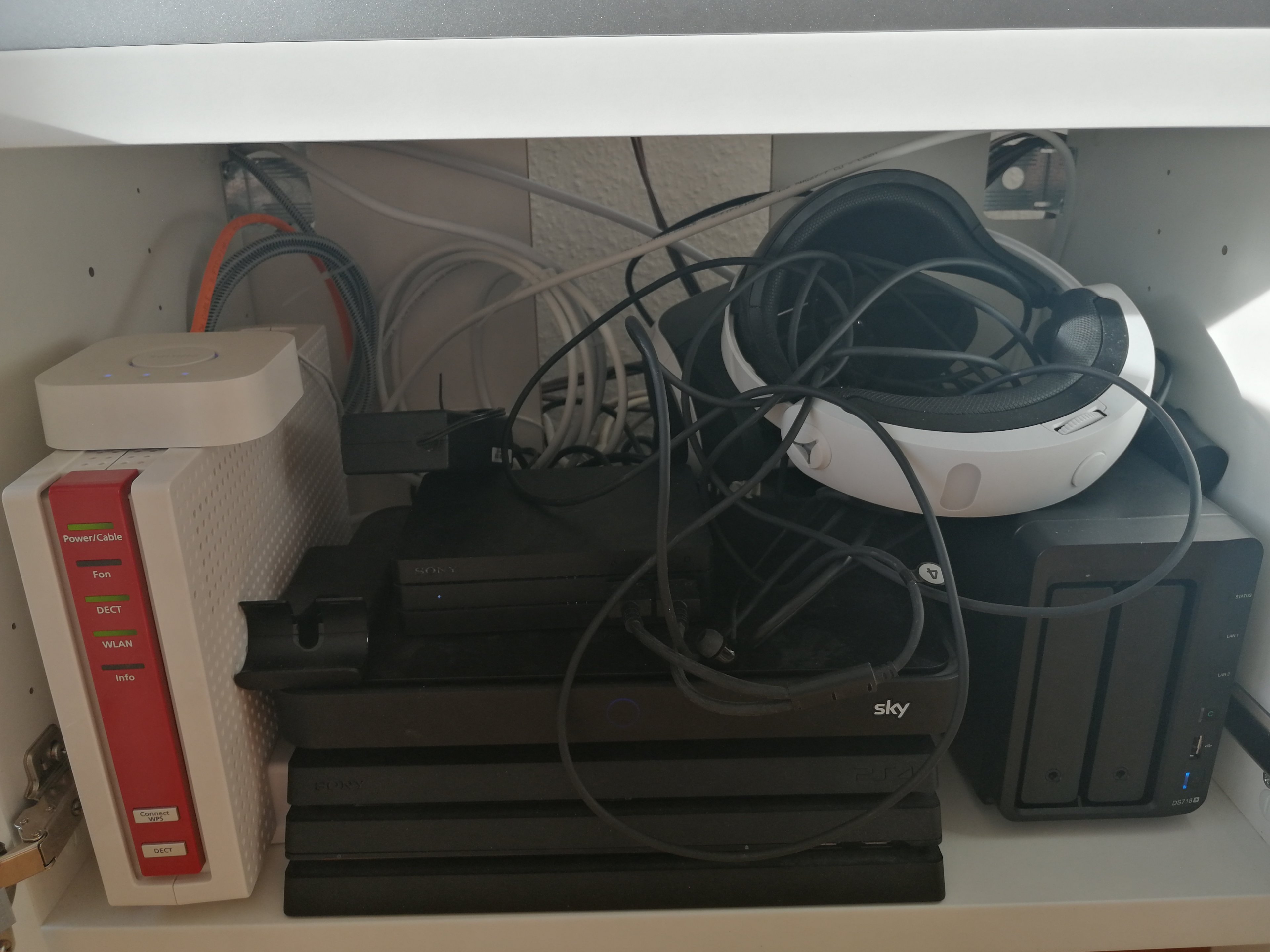 Die Frage wäre aber auch, ob das langfristig zu empfehlen ist. Ich muss natürlich gucken, wie die Temperaturen sind, wenn der Sky Receiver an ist. Wenn die Playstation läuft (selten), dann lasse ich ohnehin die Klappe auf. Aber vor allem die Fritzbox und das NAS sind im Dauereinsatz und da will ich keine Risiken eingehen.