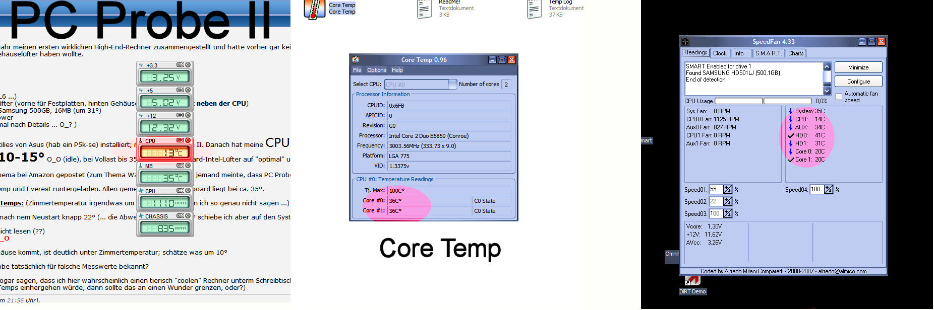 Das hatte ich in einem Diskussionsthema bei Amazon gepostet (zum Thema Wasserkühlung) und jemand meinte, dass PC Probe falsche Werte ausgeben würde und 10-15 Grad gar nicht sein könnten ...