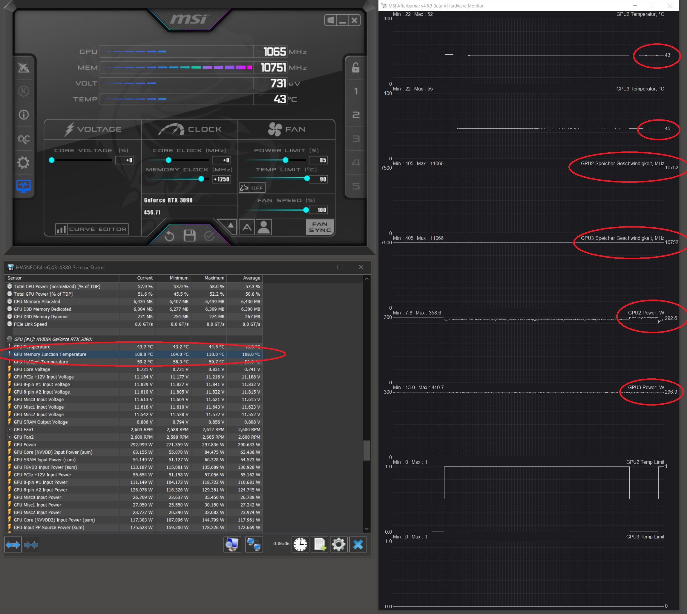 Im MSI Afterburner sind beide auf PL 85%, GPU Clock stock, Mem Clock +1300Mhz, CoreVoltage 0% Offset, Fan 100% und TLimit 99 Grad eingestellt.