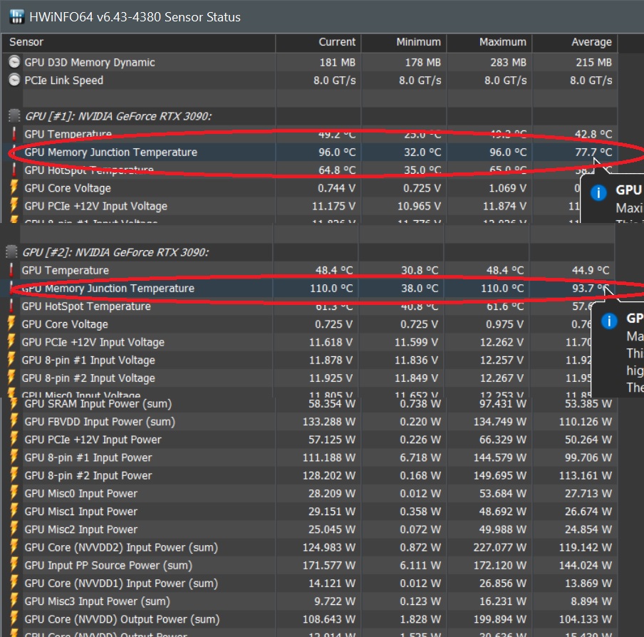 Trotz exakt gleicher Einstellungen und gleicher Temperaturen geht Karte 1 nach ca 2 Minuten ins Temperaturlimit und Leistungsaufnahme um ca 10% runter, Karte 2 läuft aber einwandfrei mit max Leistung. Beide Karten haben gleiche Temperaturen mit Luftkühlung (<50 Grad Celsius laut HWinfo, Lüfter 100%, offenes Gehäuse).