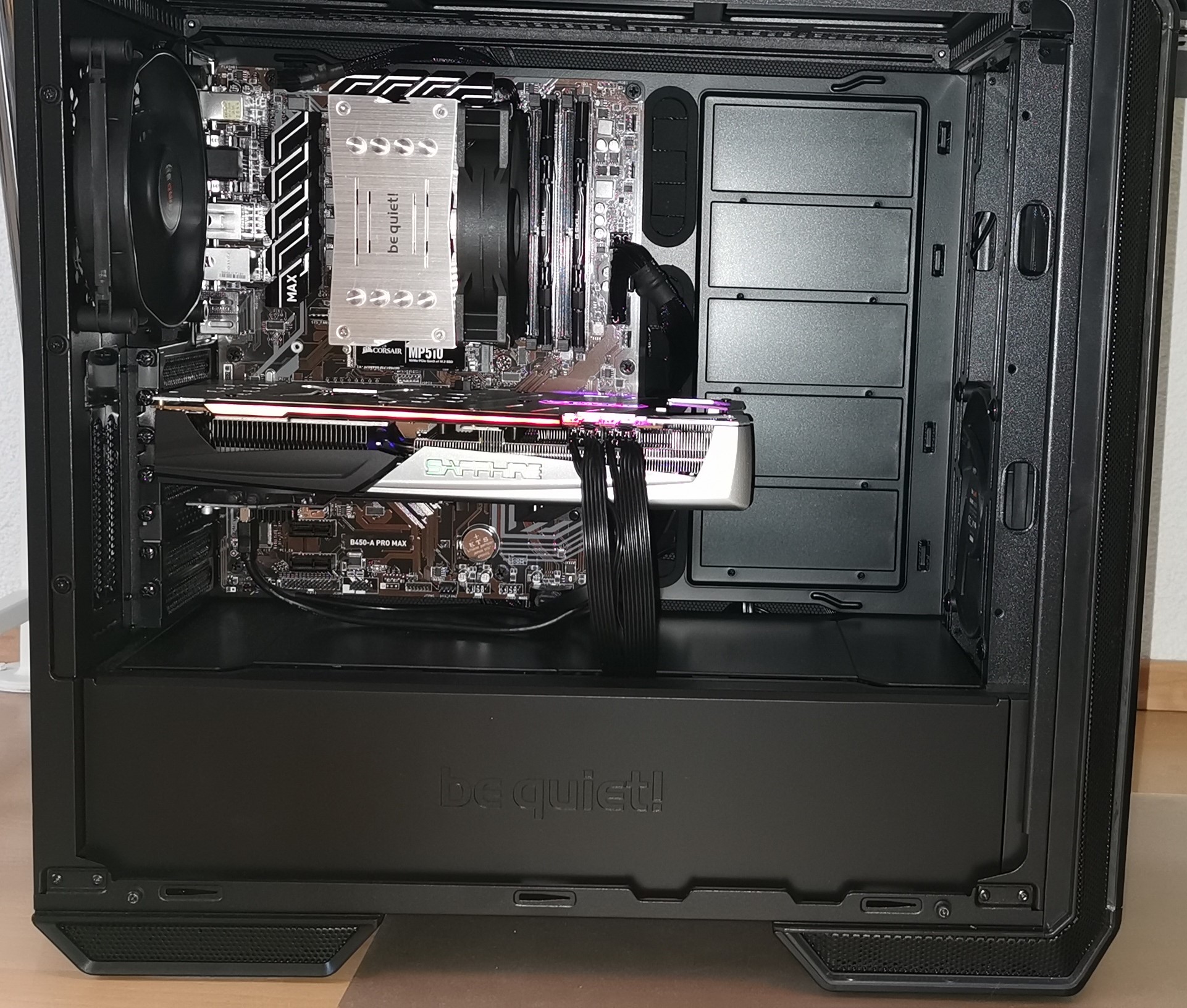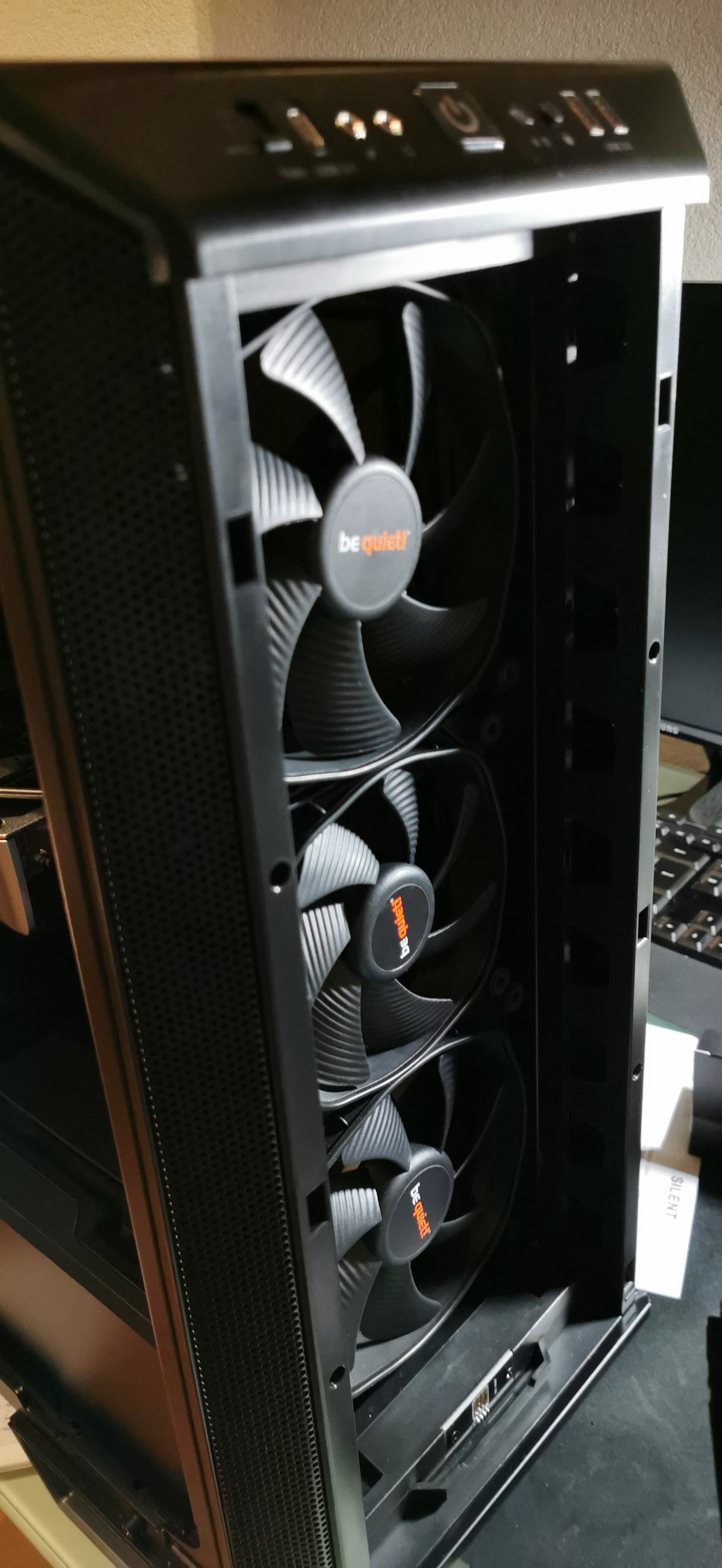 Sapphire Radeon RX 590 Nitro+ 8G und meine Vorgängerkarte 8GB Sapphire Radeon R9 390 Nitro. Bei allen Karten ist mir aufgefallen das die Temperaturen des Be quiet Gehäuse extrem wärmer waren als bei meinm alten 0815 Sharkoon Gehäuse. Sobald ich nur in den Startbildschirm von z.b Borderland 3 reingehe, taktet die Karte gleich mit 100% Leistung und nach 5 min. kann man das Gehäuse im oberen Bereich bei den Lüftungsschlitzen nicht mehr anfassen. Die Graka Temperaturen liegen laut dem was ich so im Internet lese im normalen Bereich bis 83 Grad. Ich habe beim Bau des Rechners nichts an Lüfter geändert. Unter die Grafikkarte habe ich nur noch einen USB 3.1 Adapter eingebaut das ich die Schnittstelle vorne am Rechner auch anschließen kann da das Mainboard diese Möglichkeit nicht bietet.Aber sowas kann doch nicht so einen Wärmestau erzeugen!? Ein Kollege von mir hat sich zur selben Zeit einen Rechner zusammengestellt und betreibt es mit einem be quiet Pure Base 600 und sagt mir das bei ihm bei gleichen Graka Temperaturen die Öffnungen nur lauwarm werden. Ich sitze hier Abends neben einem Heizkörper der mich manchmal zum Garderobenwechsel auf kurze Hose zwingt weil die Hitze so staut :-) Gibt es eventuell jemanden der die gleichen Erfahrung gemacht hat oder ein paar Tipps hat was man ändern kann. Versteht mich nicht falsch. Mir ist schon klar das Leistung wärme erzeugt. Aber mein alter Rechner hat bei schlechteren Gehäuse nicht annähernd die Wärmeabfuhr produziert und mein Kollege berichtet mir von seinem Rechner auch was ganz anderes. Nun noch etwas zu meiner PC Konfiguration und paar Bilder zum System. Danke für jede Hilfe!