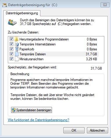 Geh auf die Schaltfläche "Systemdateien bereinigen". Dann geht das Fenster Neu auf, du mußt den Durchlauf nochmal Aktivieren, kannst nochmals Auswählen und mit "Ok" wird dannn abschließend alles bereinigt, was du ausgewählt hast. Dann sollten die besagten Temporären Dateien gelöscht sein.