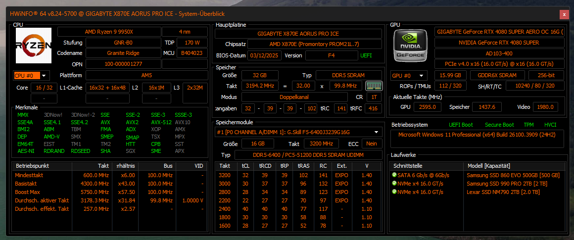 - Mainboard: …Gigabyte X870E Aorus Pro ICE