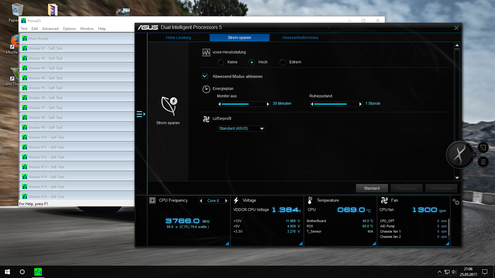 Stundenlang Prime laufen lassen halte ich für unnütze Folter der CPU(soll Leute geben, die das 25 Stunden machen)....du musst dich ja nicht bis auf den kleinstmöglichen Schritt an die Grenzen der CPU herantasten....nur 1,38V sind meiner Meinung nach unnütz viel Spannung für 3,8GHz.