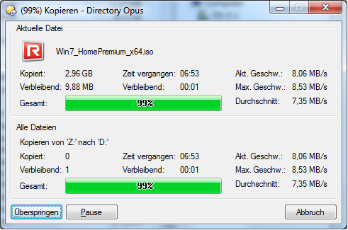 Statt wie zuvor 'nur' 6.2 MByte/s zu übertragen im Schnitt, liegt mit dieser Konfiguration die mittlere Geschwindigkeit bereits bei 7.3 MByte/s. Ich beobachtete dabei im Taskmanager, daß die Übertragungsgeschwindigkeit sogar bei 8 MByte/s lag aber immer wieder kurze Einbrüche auftraten. Daher die geringere mittlere Geschwindigkeit.