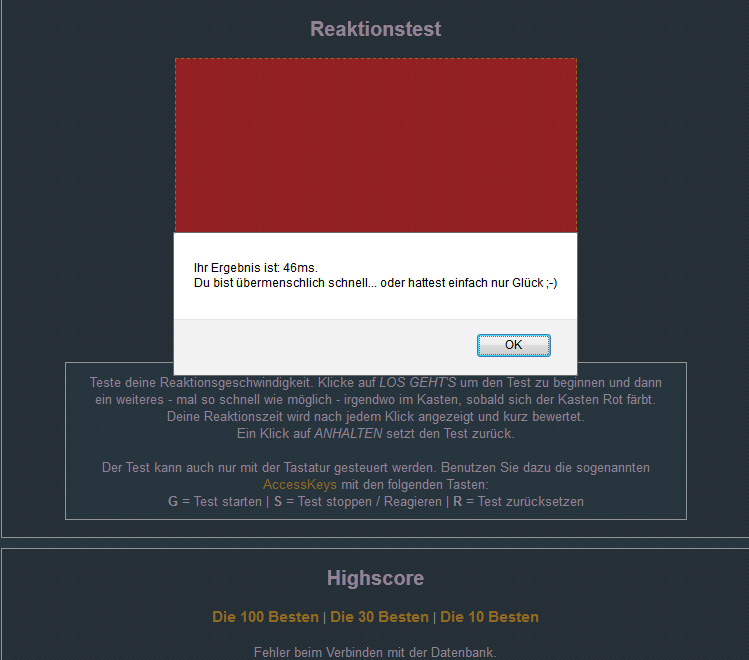 Um das große Problem der Fake-Ergebnisse so gut wie möglich zu minimieren, werde ich Ergebnisse die per Screenshot gepostet werden, abhängig von der Anzahl der Testpersonen, mehrfach bewerten. Also wenn ihr Lust auf ein vernünftiges Ergebnis und ein paar Minuten Zeit habt, würde ich mich über ein paar Knipser sehr freuen