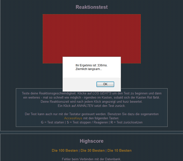 Der Test ist relativ einfach durchzuführen. Dazu müsst ihr nur auf den "LOS GEHT'S" Button klicken und euren Cursor auf das weiße Feld bewegen. Verändert das weiße Feld seine Farbe in rot, müsst ihr so schnell wie möglich auf das Feld klicken. Daraufhin wird euch eure Reaktionszeit angezeigt.