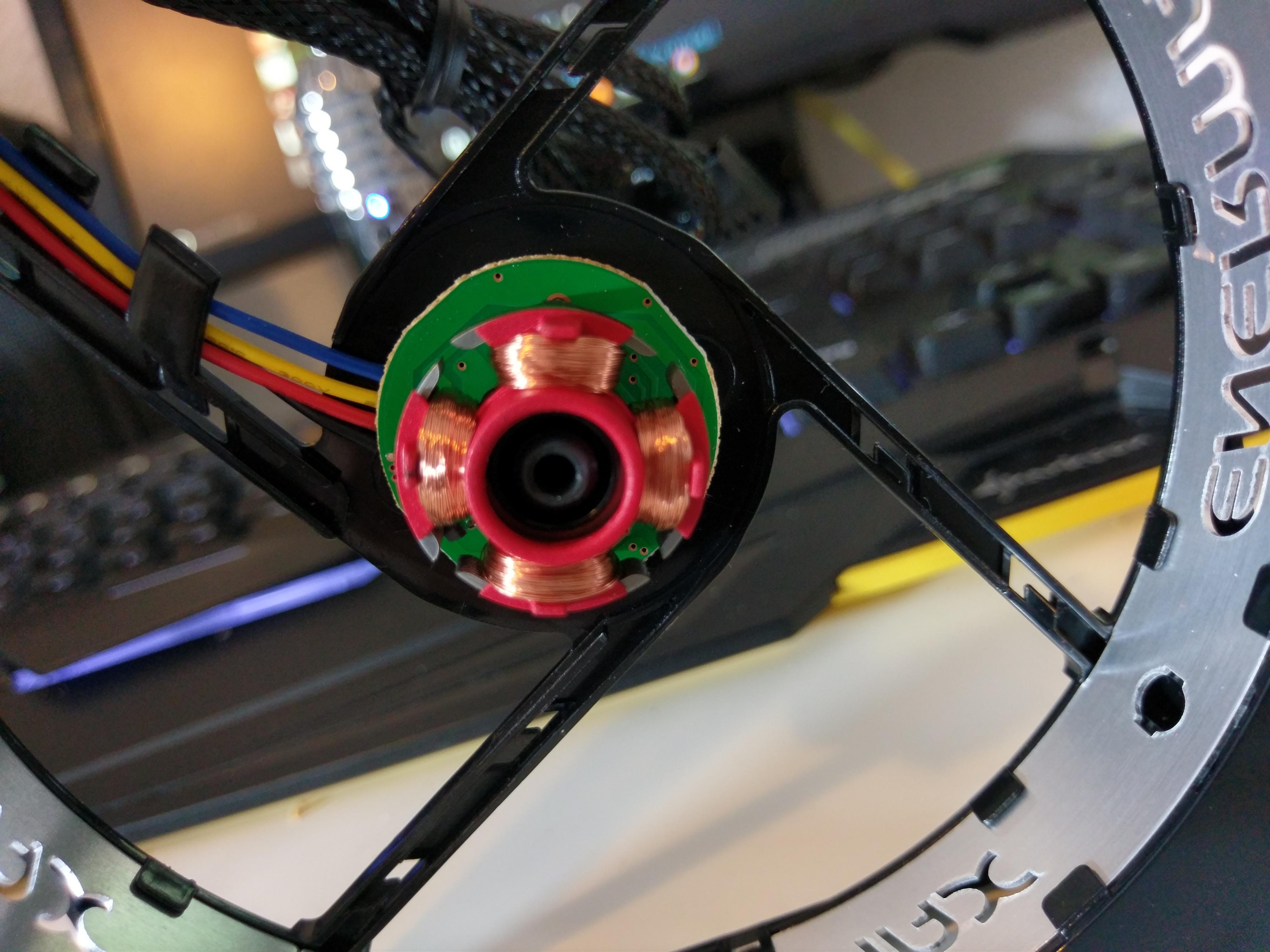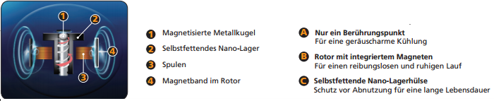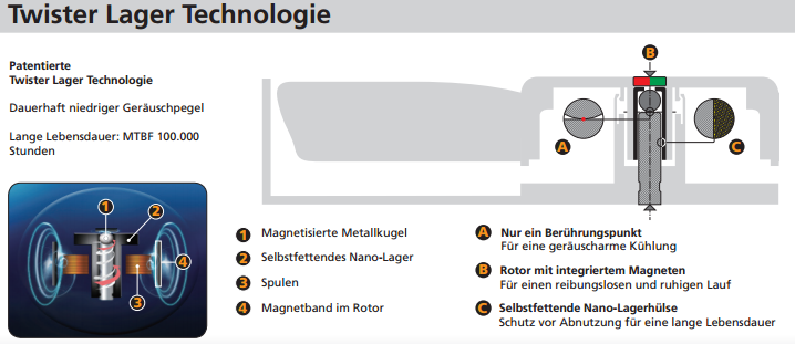Durch den einzelnen Berührungspunkt sollen die Lüfter beim Drehen einen deutlich niedrigeren Widerstand besitzen und dadurch soll sich die Geräuschkulisse minimieren und eine hohe Lebensdauer zu garantiert werden.