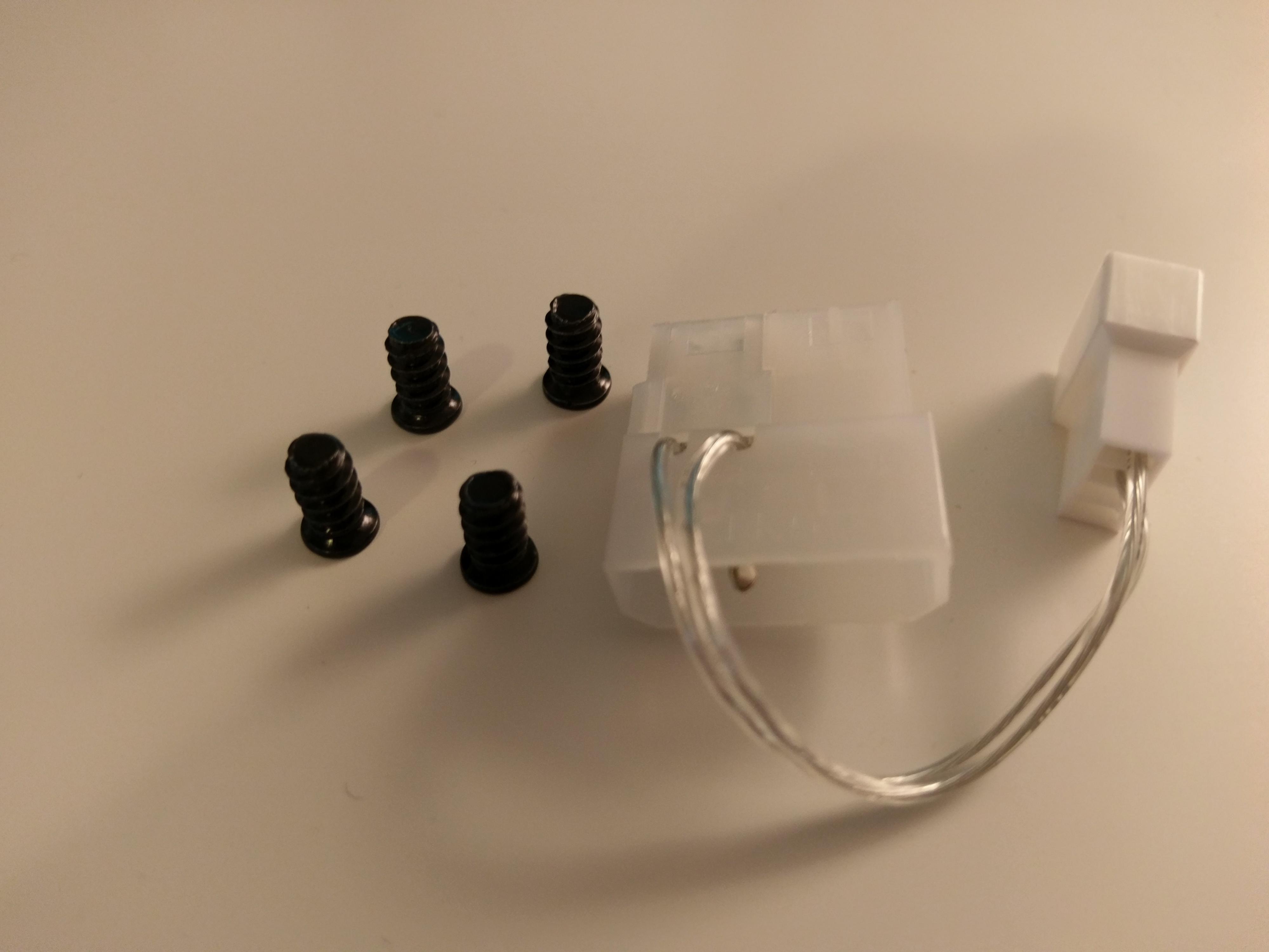 Zu den Lüfter liegen 4 schwarze Schrauben sowie ein nicht gesleevter 4pin Molexadapter.