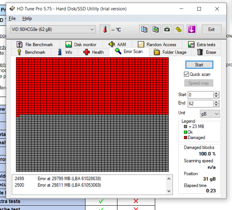 hab ich gemacht scheint zu fenzen, allerdings zeigen mehrere Versionen von hd tune Fehler auf. Die frage ist liegt das daran das der Speicher fehlerhaft ist, oder ist der Speicher einfach unbekannt?Snoop7676 schrieb:Logisch. Aber er kann es mit H2testw einmal komplett vollschreiben lassen und anschließend auslesen lassen und bekommt dann gesagt ob alle Daten korrekt ausgelesen wurden oder ob stellenweise korrupt.