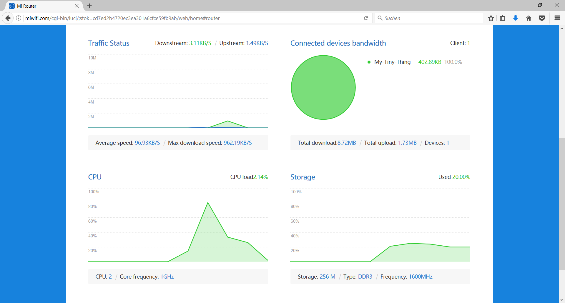 Die Benutzeroberfläche an sich sieht sehr aufgeräumt und gut strukturiert aus. Noch dazu kann man sich den Traffic, die CPU- und die Speicherauslastung ansehen.