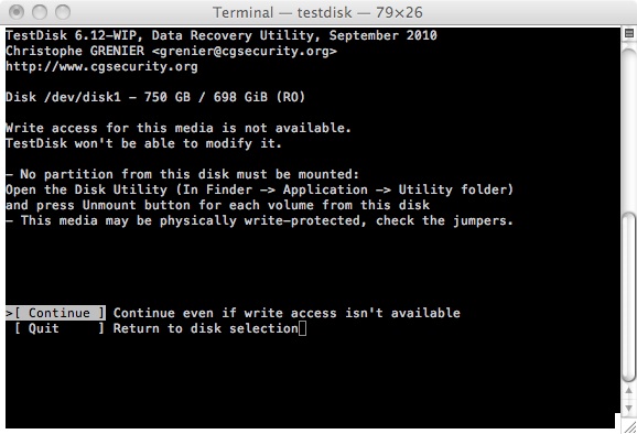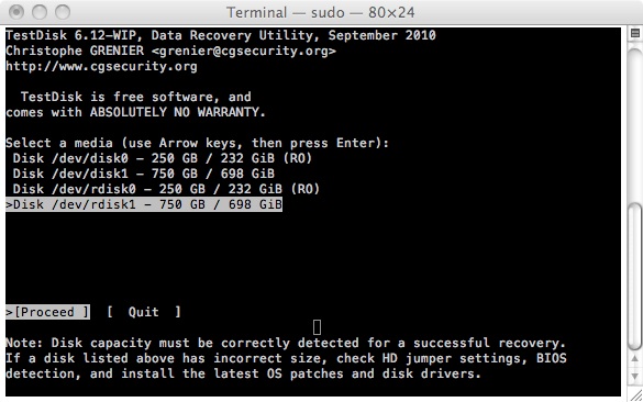 Nun habe ich mir ein neues Terminalfenster aufgemacht, mit dem Befehl su - meinbenutzername und Passwort angemeldet und anschließend die testdisk-Datei auf das Terminalfenster gezogen. Daraufhin sagt mir Testdisk, ich sei nicht als root angemeldet und müsste mich über den sudo-Befehl einloggen, um alle Festplatten zu sehen.