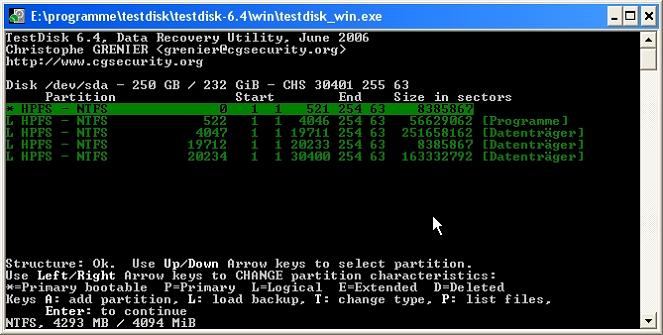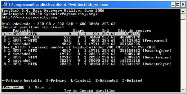 ich habe die festplatte schon phyikalisch untersuchen lasen (hutil - oh, platte ist samsung sp2514n) und sie ist ok. dann habe ich testdisk mal gestartet und gleich der erste screen nach der auswahl der platte ergab, dass irgendwas faul ist.