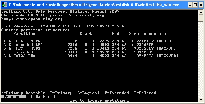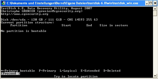 Hinterher geht es weiter, das du in Testdisk auf dieser Festplatte mal die gesamte Partitionstabelle löschst.