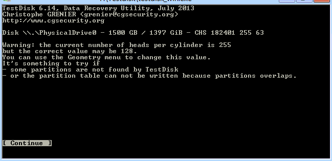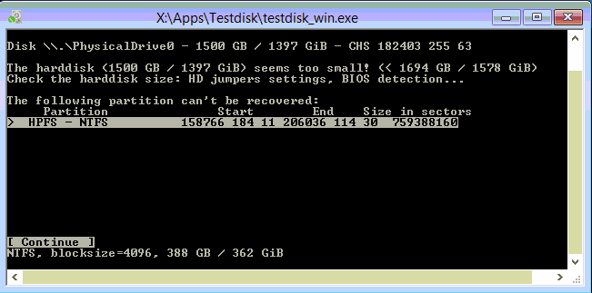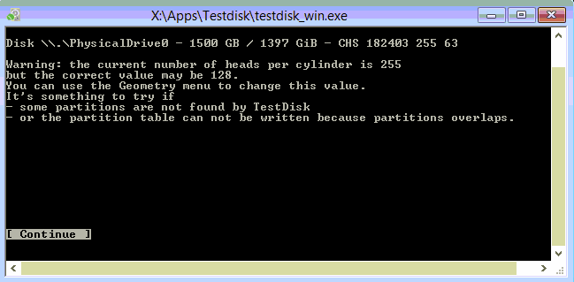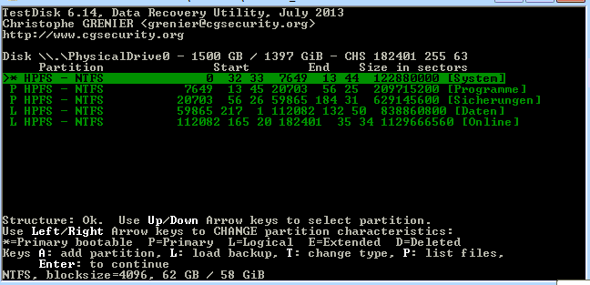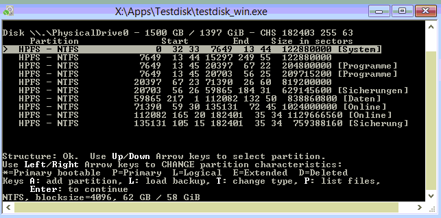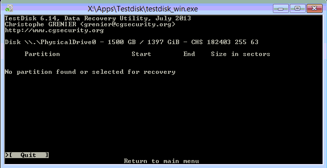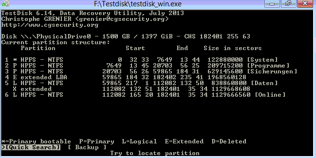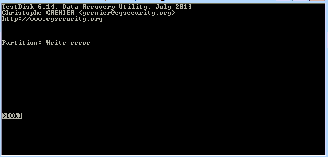 Jetzt habe ich versucht im Windows Rescue System per Testdisk die Partitionstabelle wiederherzustellen. Jedoch bekomme ich eine leider sehr allgemeine Fehlermeldung. Abfolge von links nach rechts: