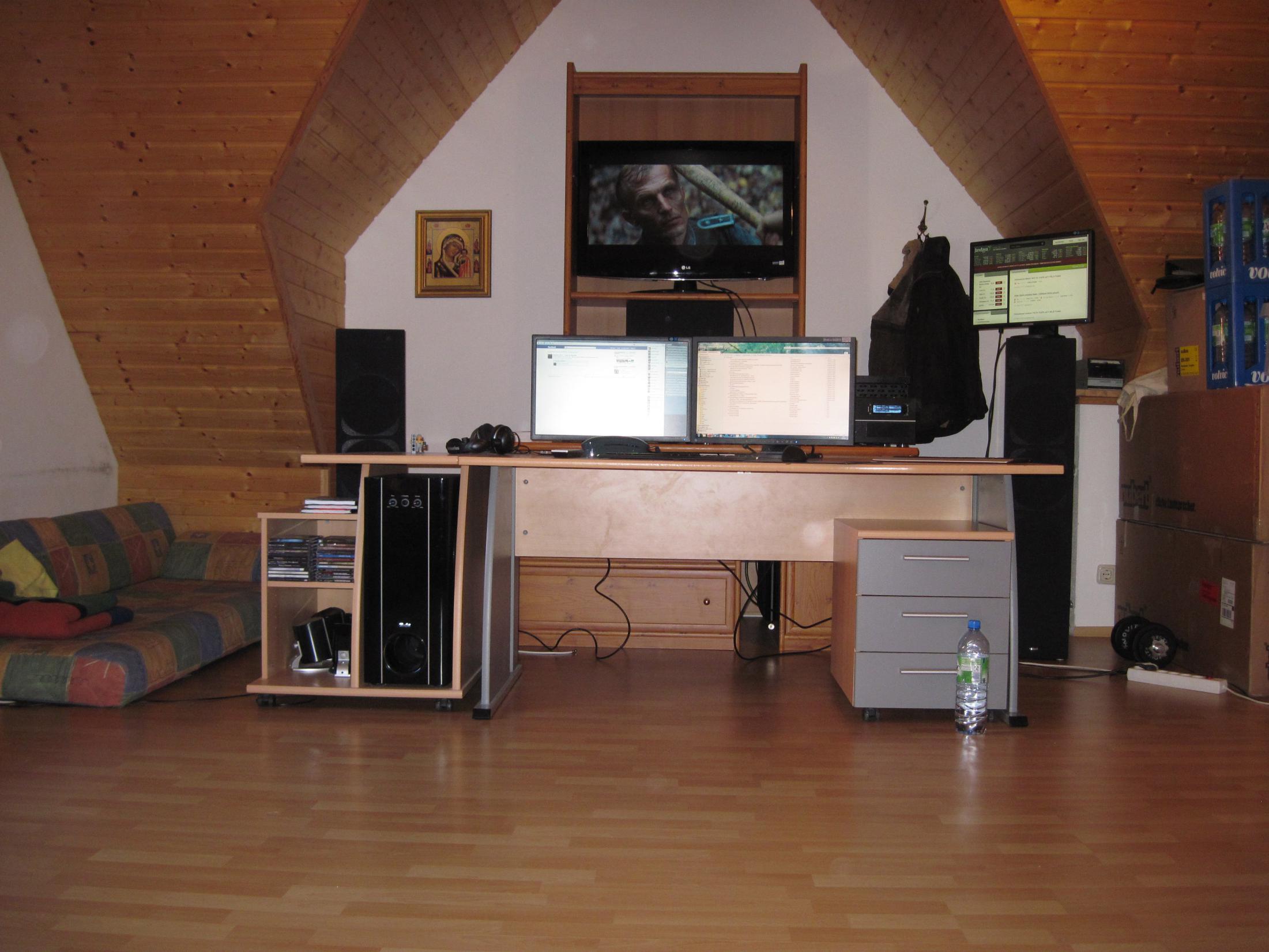 Der Tisch den du da siehst wird in absehbarher Zeit komplett von einem selbst geschreinerten massiven Nussbaum Tisch ersetzt, der nur links und rechts zwei Stützen hat und sonst nichts - auch kein Sichtschutz. In Zukunft wird der Tisch also keinen Schall mehr behindert!