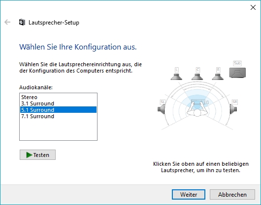 Den "normalen" Sound gebe ich jetzt über die USB-Soundkarte an das Gerät. Für die Soundkarte habe ich nicht die Treiber von Teufel installiert sondern nutze die Windows eigenen Standard-Treiber; diese langen vollauf. Die Soundkarte habe ich auf 2.0 gestellt mit Vollspektrum-Lautsprecher und lasse den Upmix vom Teufel seine Arbeit machen. Das funktioniert soweit sehr gut. Für Musik und generelle Geräusche ist dies eine gute Wahl.