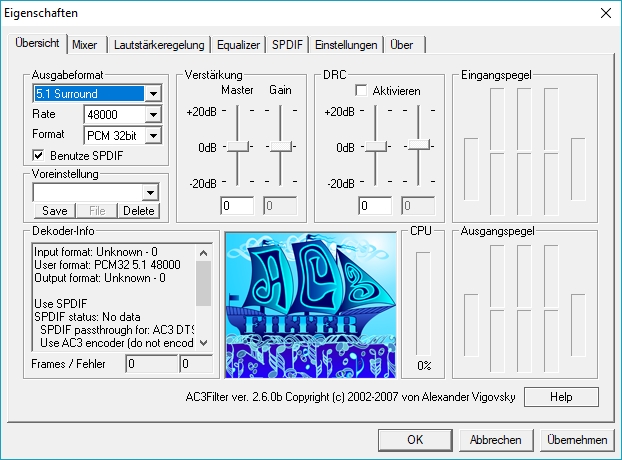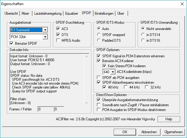 - Folgende AC3-Filter Einstellungen habe ich gewählt (wichtig is hierbei S/PDIF Passthrough)