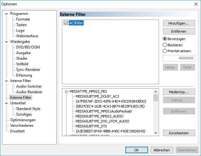 - AC3-Filter als externen Filter im MPC-HD hinzufügen als bevorzugt