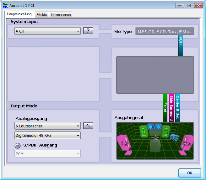 Ich habe nun das ganze auf meiner Motherboard integrierter Soundkarte ausprobiert, Realtek isset, funktionieren alle Sateliten mit allen Kabel.
